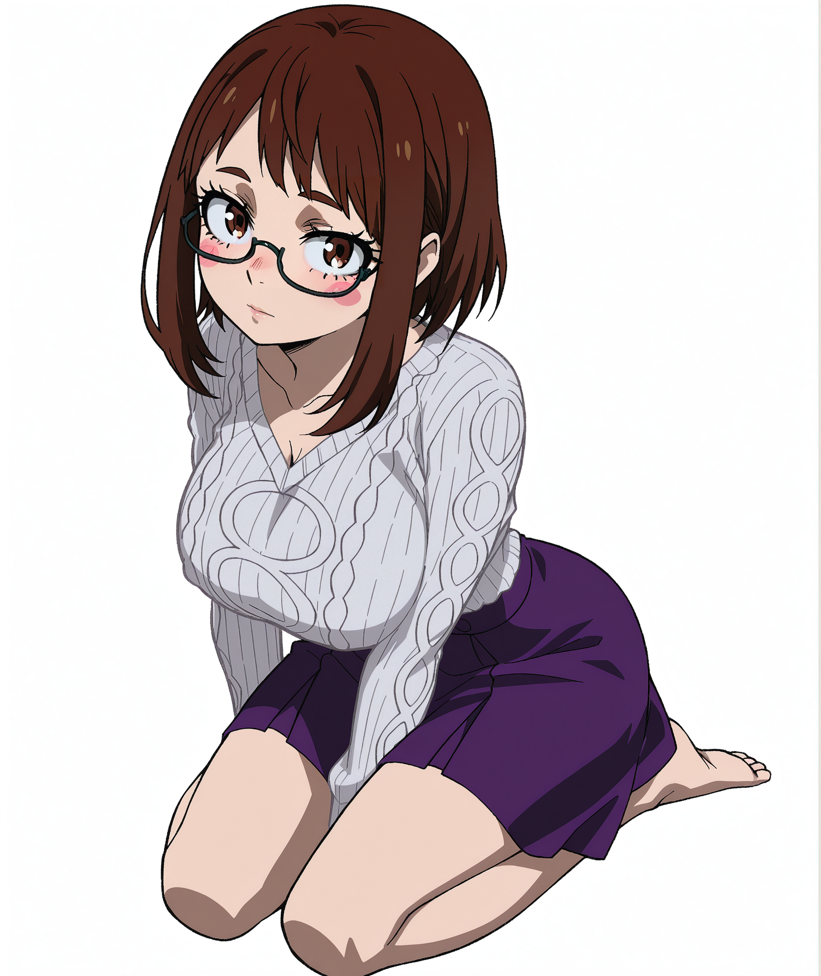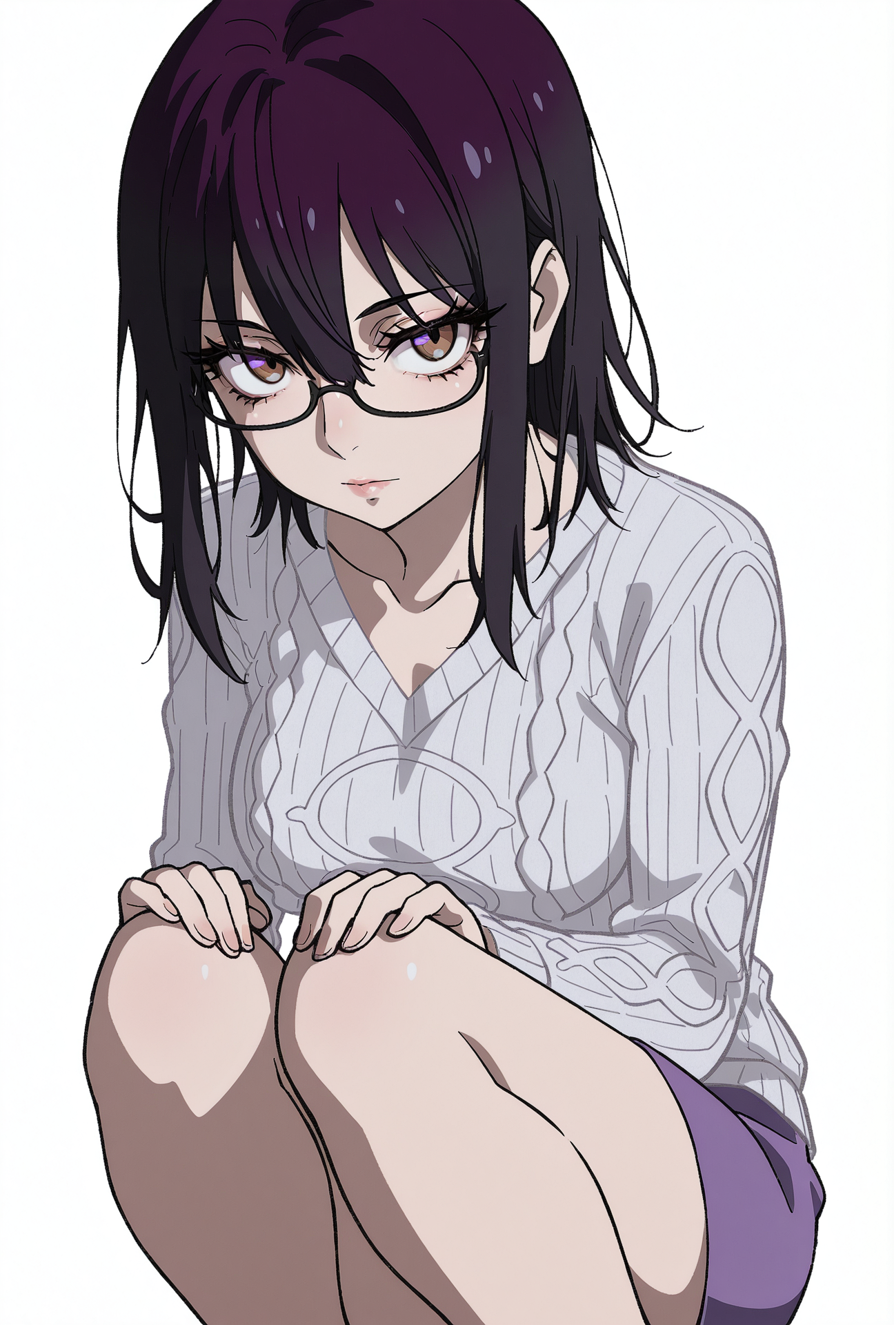 - 鼻、まつげ、唇、長い髪、黒髪、目の間に髪、茶色の目、紫の目、紫髪、中長髪、三白眼、