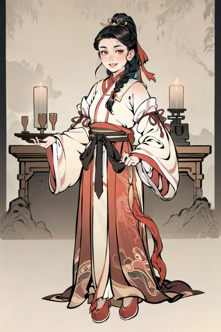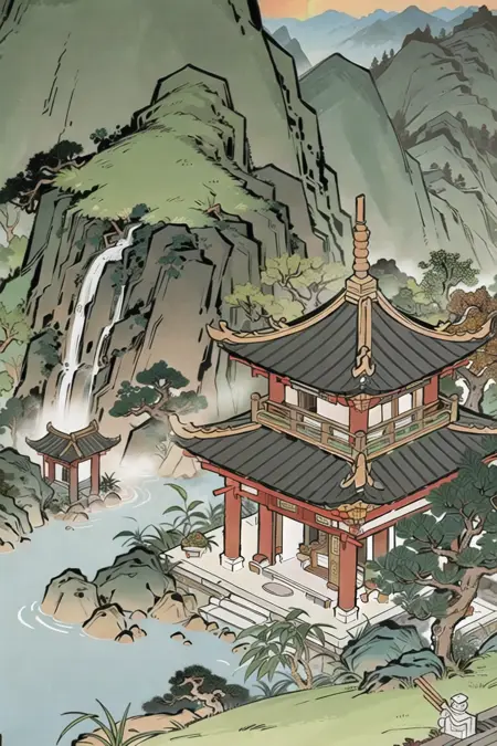 モデルの創造性 – 漫画に古風な傾向を持つスタイルモデルで、古代の建物やシーンの生成に焦点を当てる。伝統的な中国画と比較して、色は明るく、形はよりシンプルで直截的であり、古代のイラストレーションの原初的な美しさを反映している。中国画の筆致や風景の筆法を維持しつつ、人物は現代的な美的感覚に近づいている。