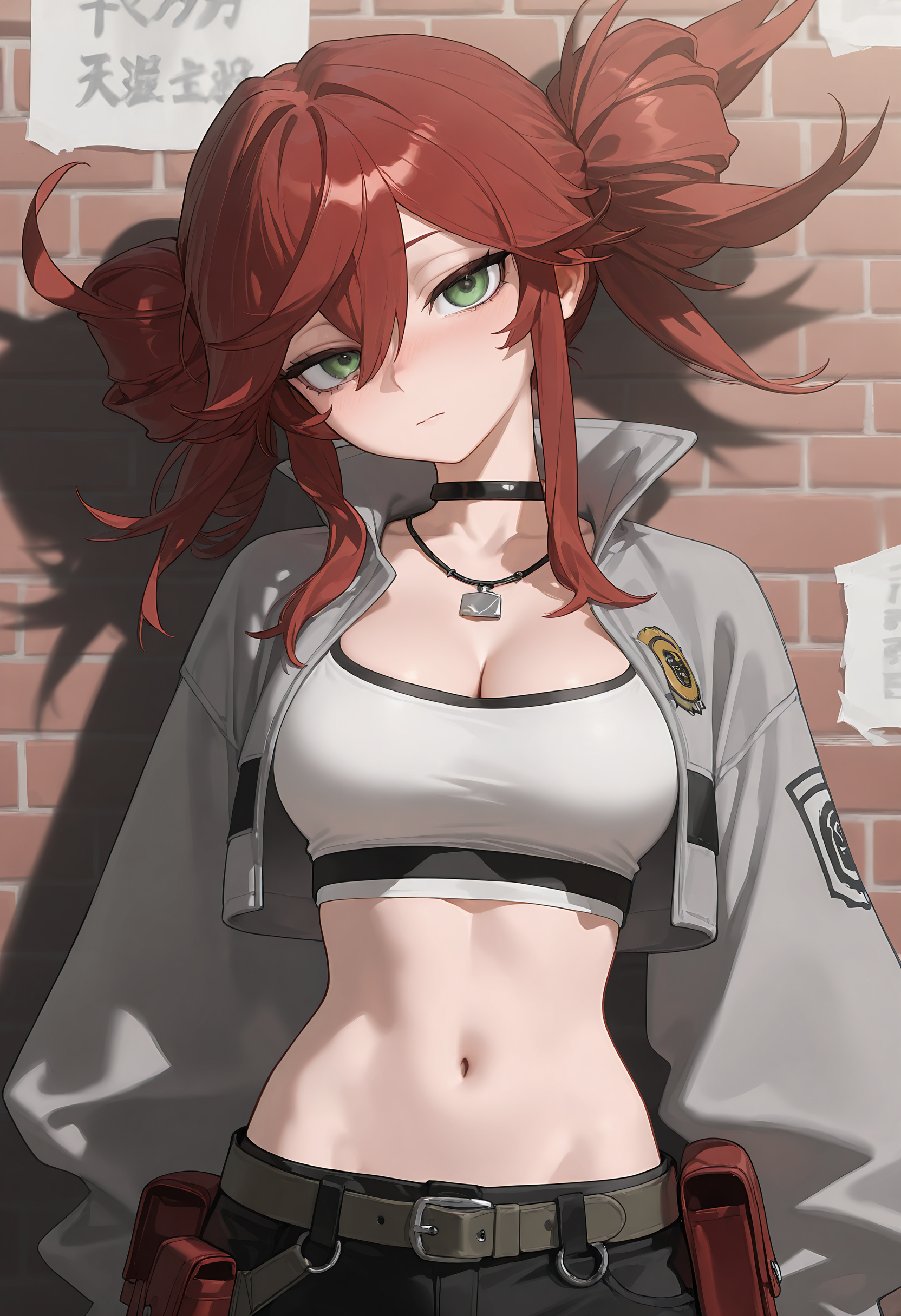 • 복장 태그: 긴 소매, 배꼽, 가슴선, 벌어진 옷, 허리, 검은 신발, 목걸이, 벌어진 재킷, 크롭탑, 손목을 넘는 소매, 짧은 반바지, 검은 반바지, 크롭 재킷, 회색 재킷, 벨트 주머니, 검은 초커, 높은 칼라, 검은 부츠, 검은 다리 보호대,