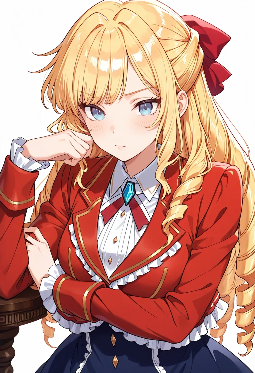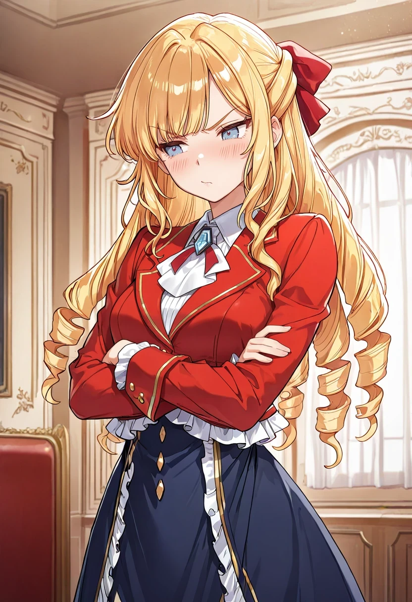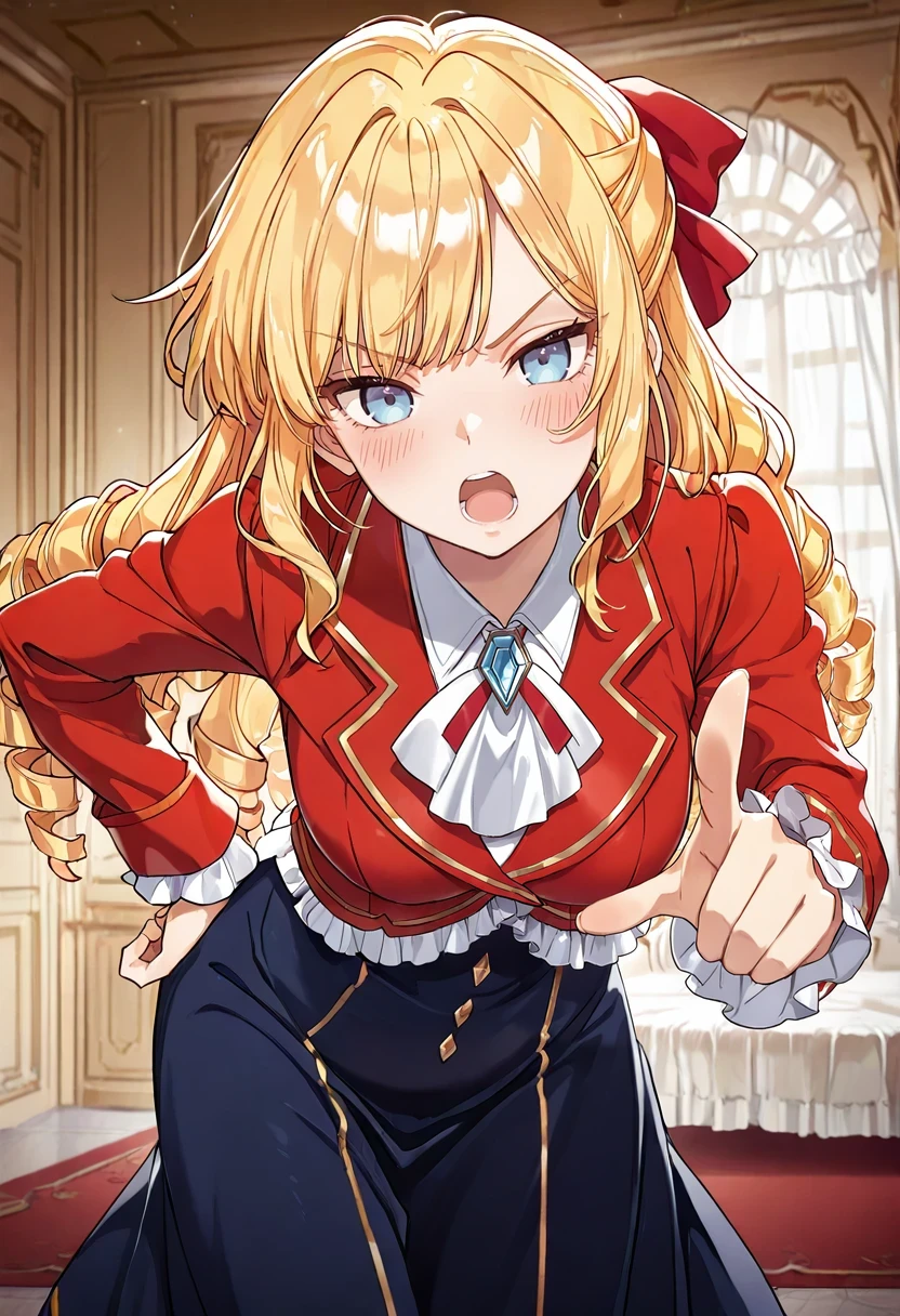 collared shirt,frills,red jacket,white_ascot,blue skirt,
