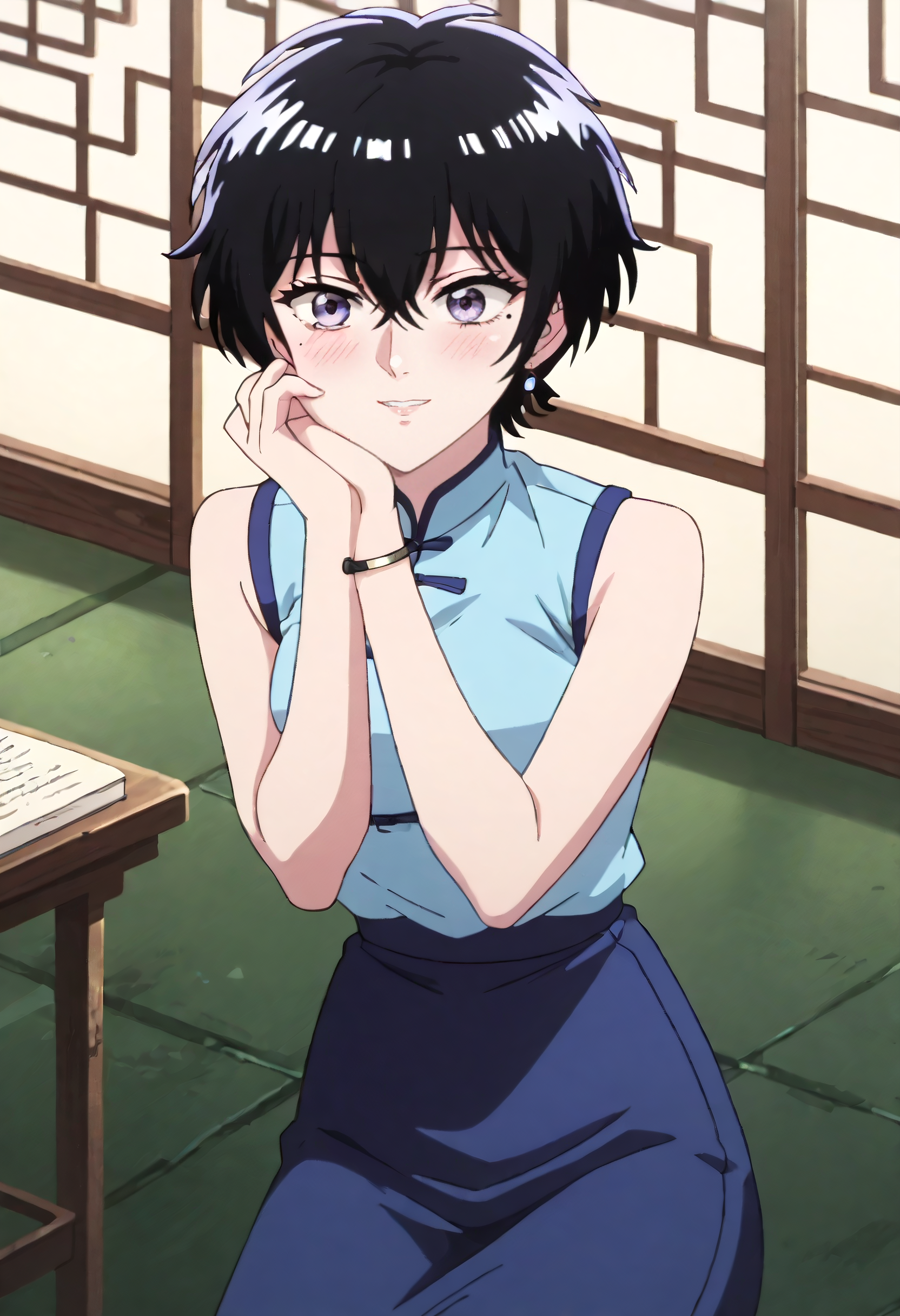 ReikoBlChShirtPuSkirtAlt、シャツ、ノースリーブ、中国風衣装、青いシャツ、ノースリーブシャツ、スカート、青いスカート、ジュエリー、イヤリング、シャツをインする、ハイウエストスカート、ペンシルスカート、ロングスカート、腕時計、時計、