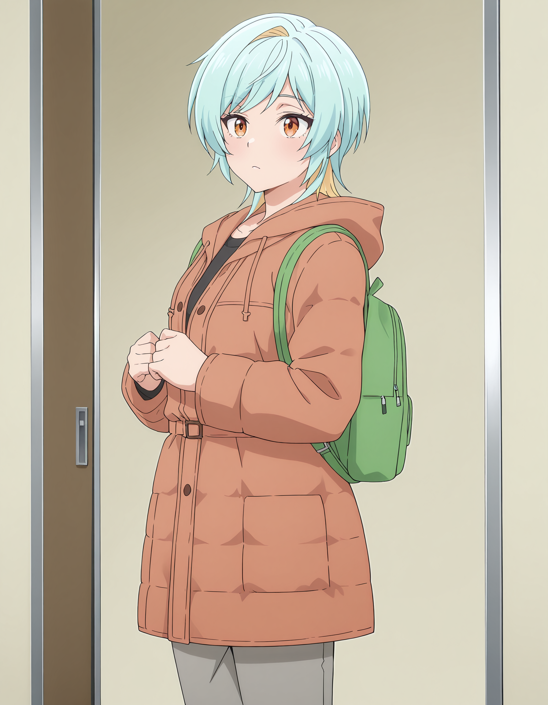 blue hooded jacket, hood down, open jacket, shirt tucked in, sleeves rolled up, dress shirt, black pants