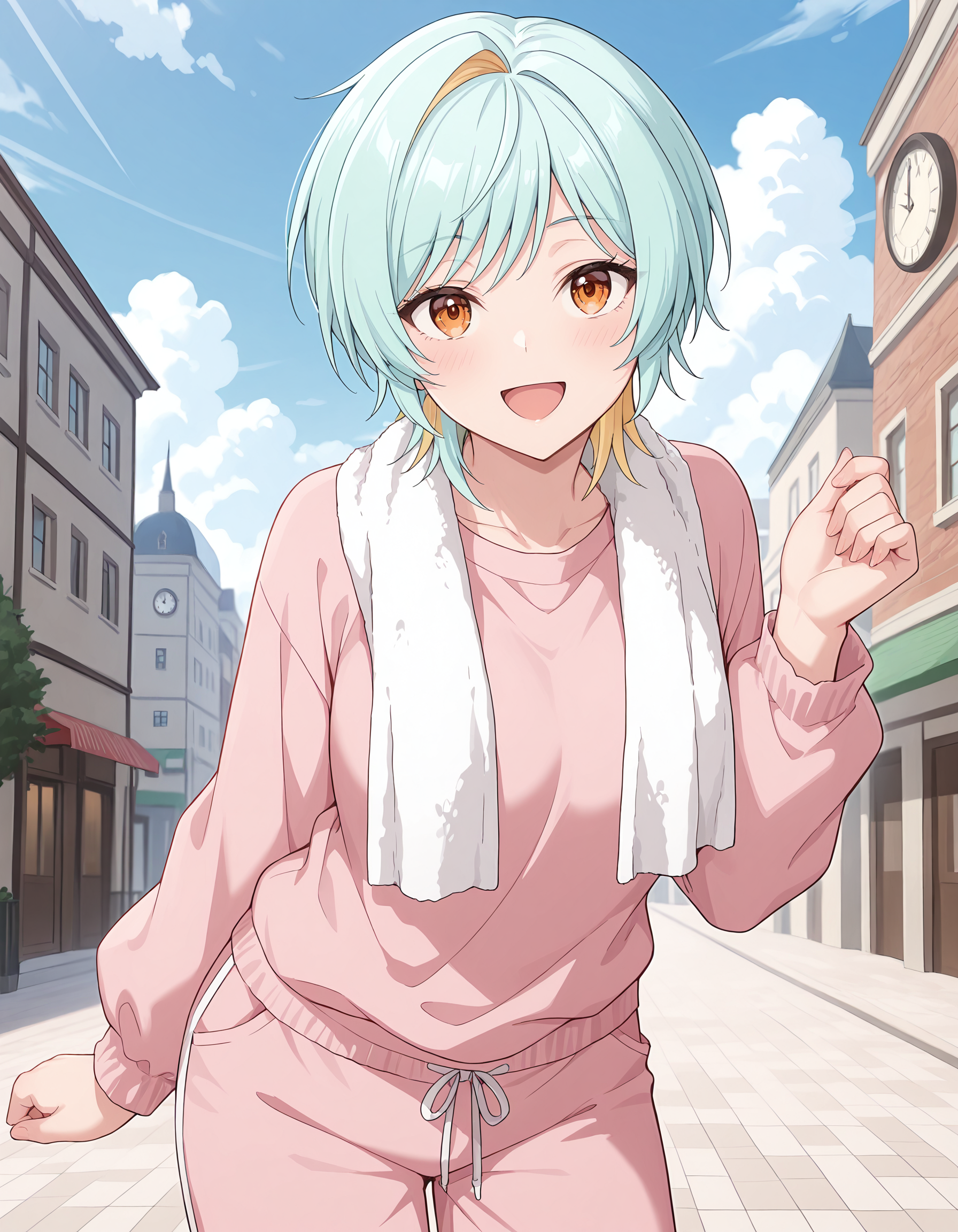 pink pajamas, pink pants, pink shirt, towel, towel around neck