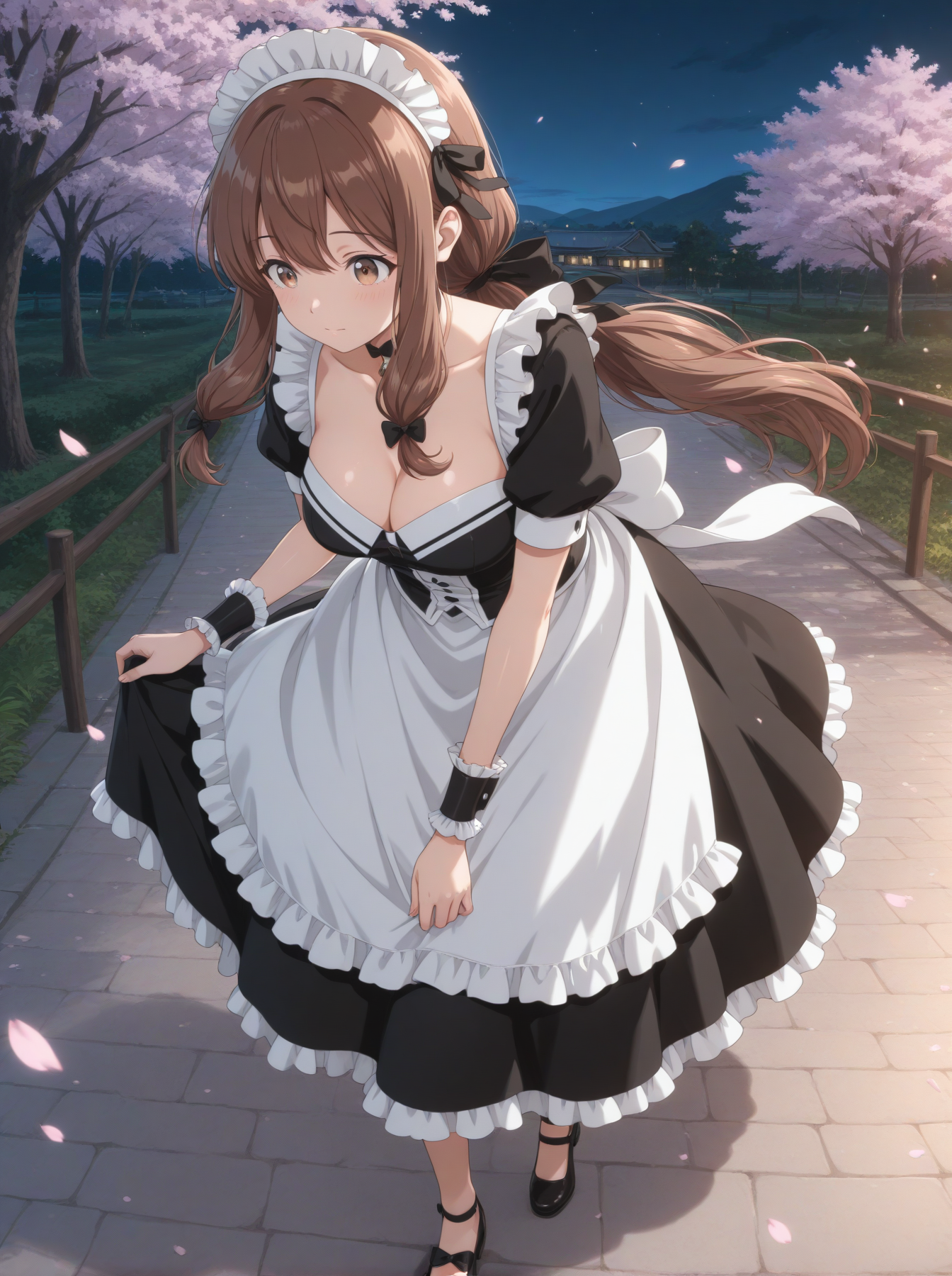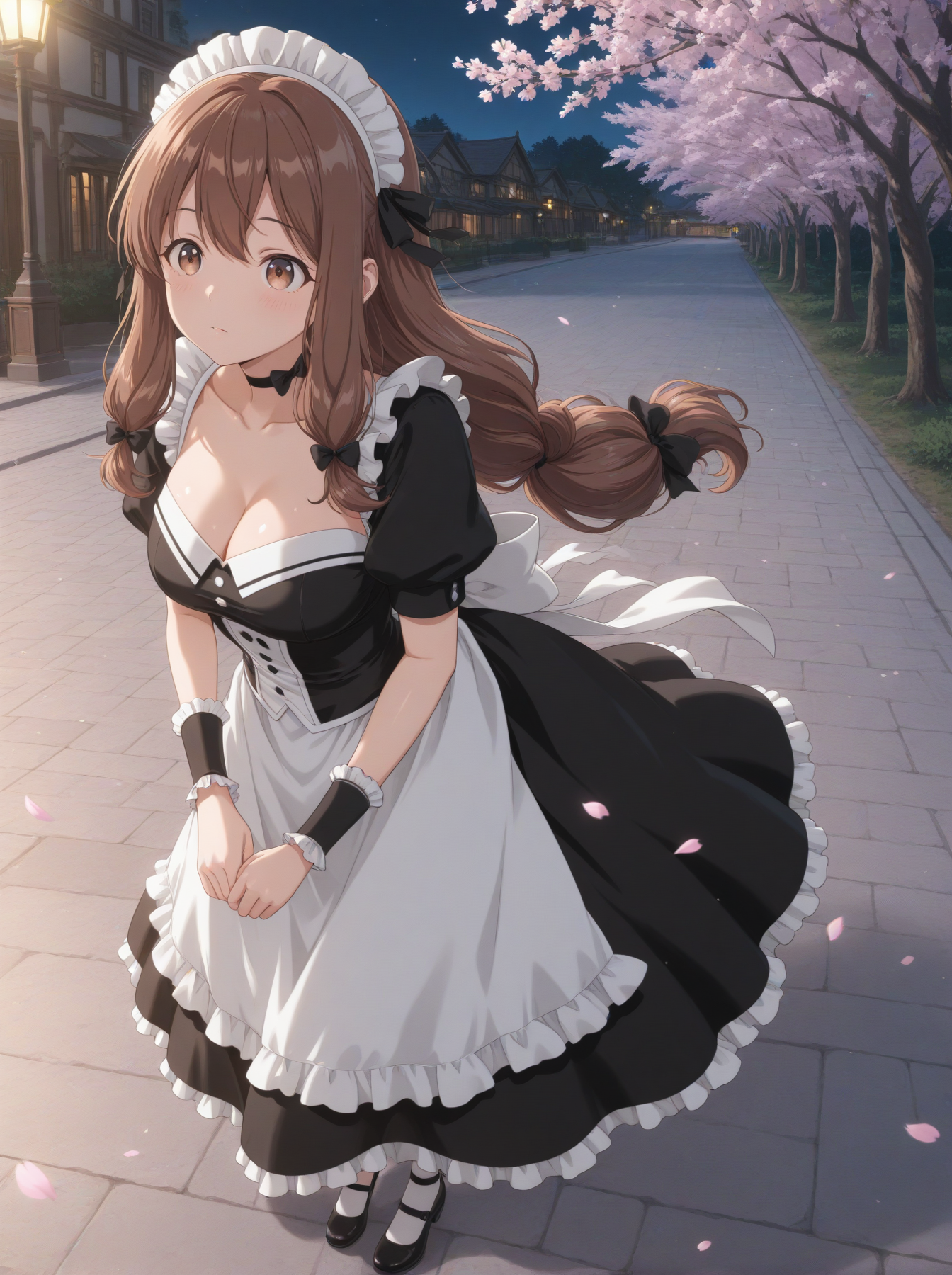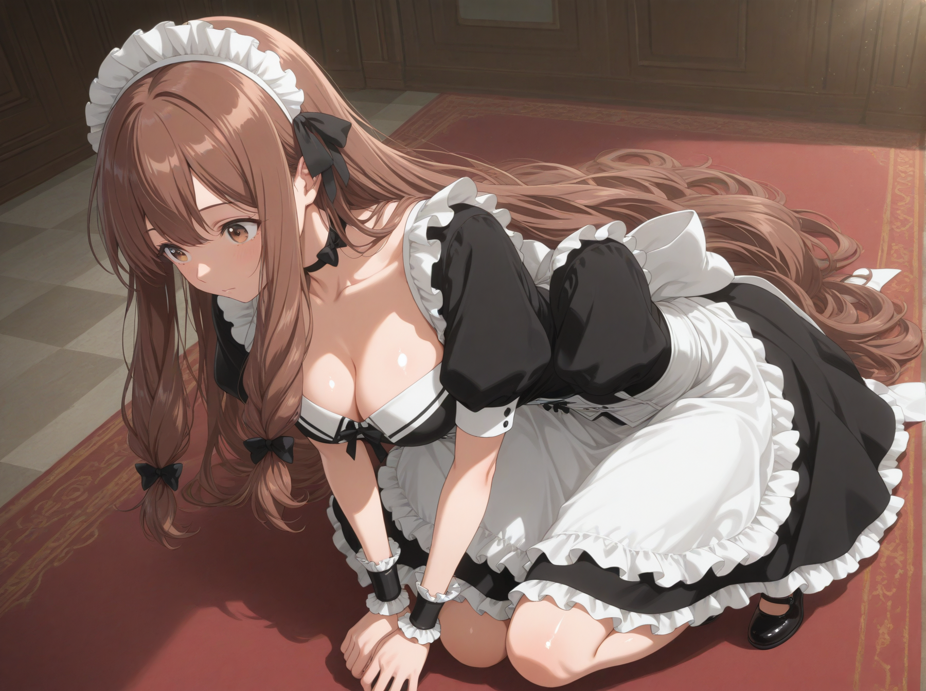 옷: (메이드 유니폼, 메이드 헤드웨어, 손목 커프스, 초커, 리본, 검은 색 드레스 신발, 가슴 노출)