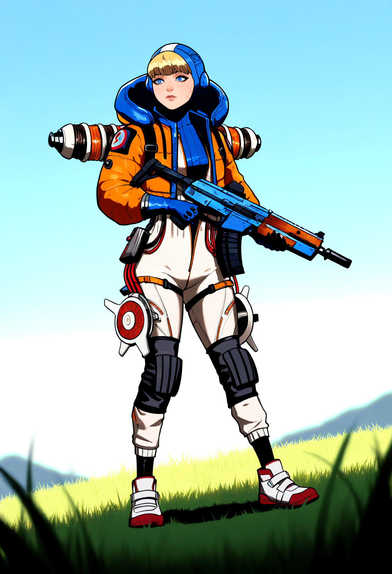 基本プロンプト:1girl, wattson, blue eyes, scar on cheek, blonde hair