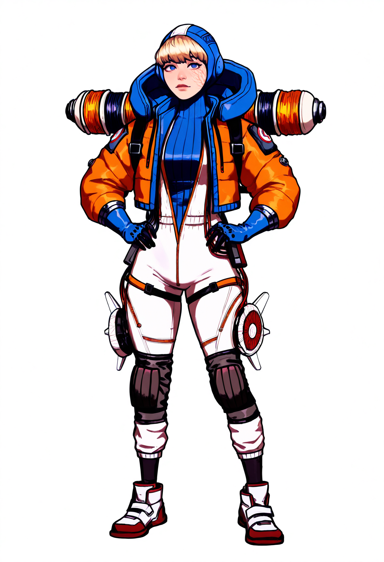 衣装プロンプト:hooded bodysuit, ribbed bodysuit, orange hooded jacket, blue gloves, white shoes, knee pads