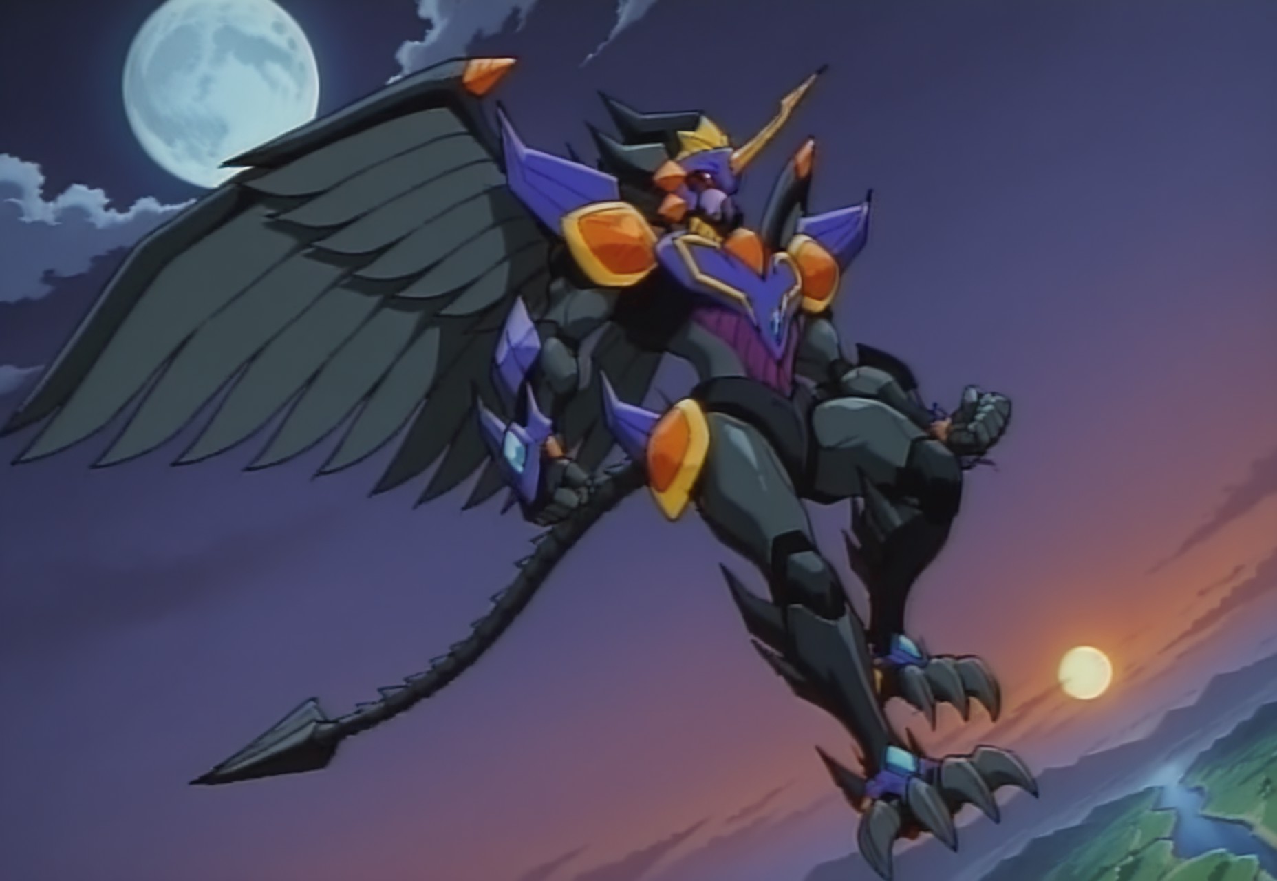 태그: 메카, 로봇, 큰 날개, 기계 날개, 기계 꼬리, 돌기, 갑옷, 갑옷 입은 몸, 가로동공, 금색 뿔, 다색 몸, 단일 뿔, 보라색 얼굴, 파란색 공막, 발톱