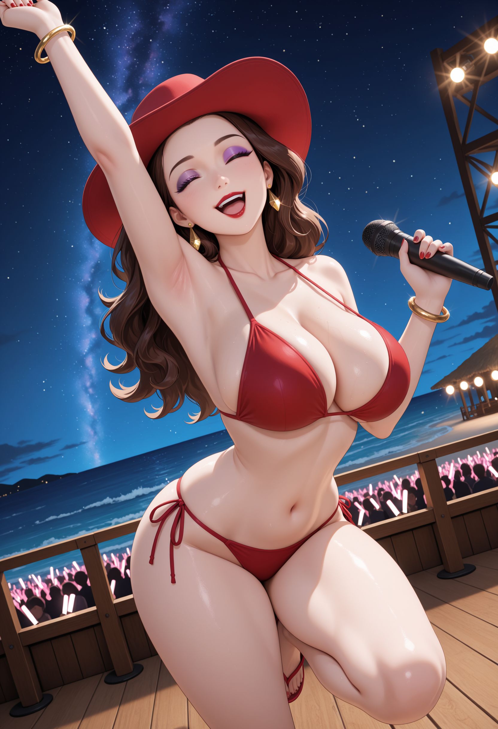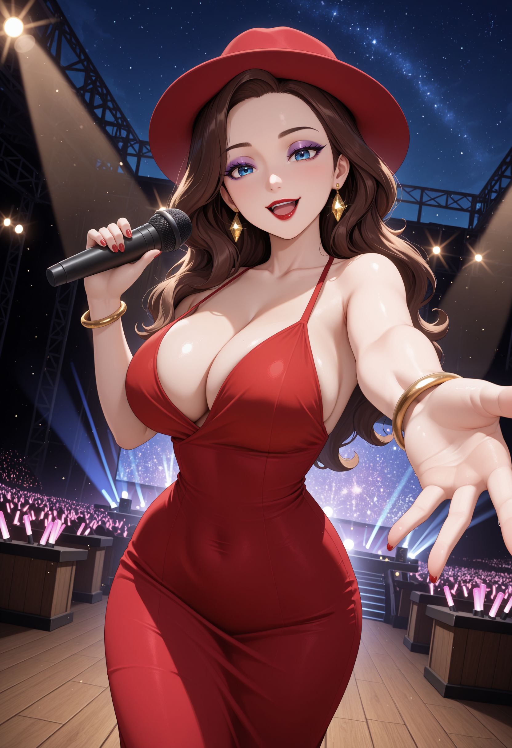 デフォルトのポーリーン:km_mario_pauline, 1girl, solo, mature female, curvy, long hair, wavy hair, forehead, makeup, purple eyeshadow, blue eyes, red lipstick, gold earrings, large breasts, narrow waist, red nails, red hat, red dress, sleeveless dress, long dress, gold bracelet, collarbone, cleavage,