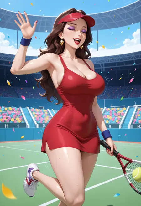 テニスのポーリーン:km_mario_tennis_pauline, 1girl, solo, mature female, curvy, long hair, wavy hair, forehead, makeup, purple eyeshadow, blue eyes, red lipstick, gold earrings, large breasts, narrow waist, red nails, red visor cap, red dress, short dress, sleeveless dress, collarbone, cleavage, bare legs, wristband,