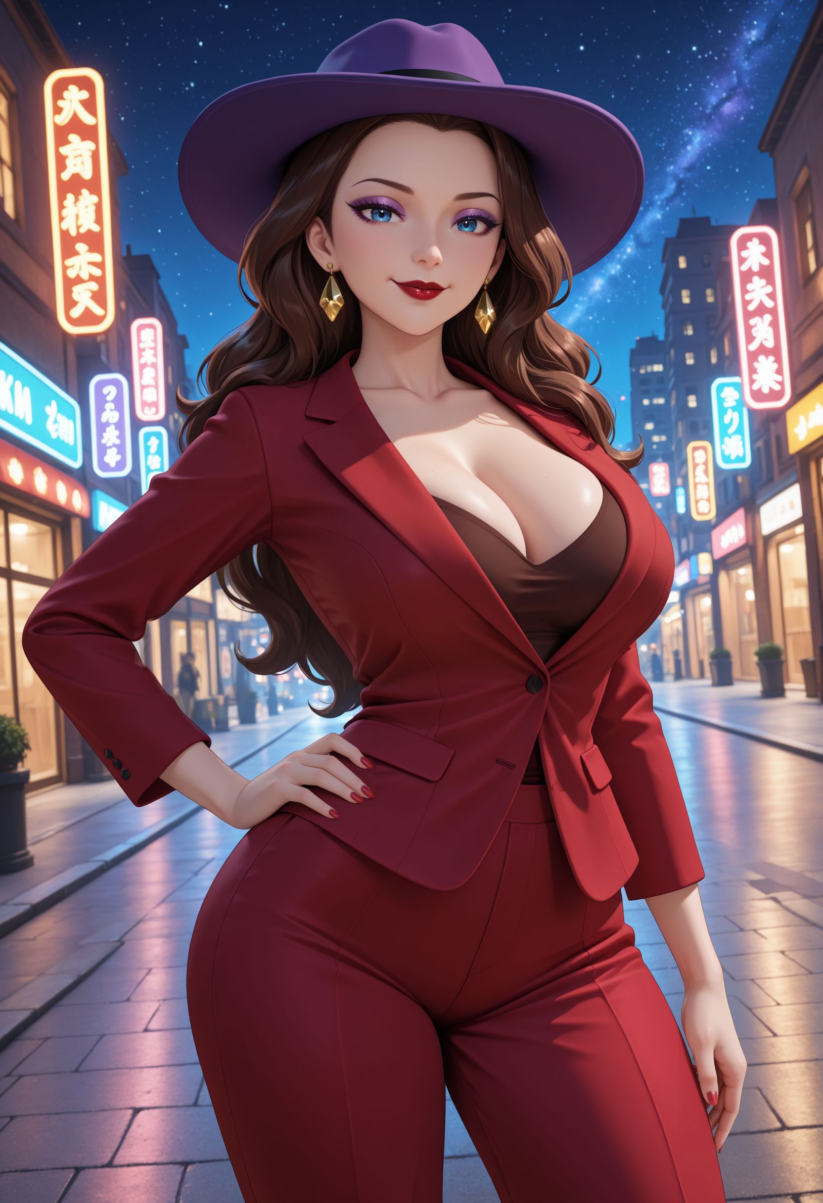 市长宝琳:km_mario_mayor_pauline, 1girl, solo, mature female, curvy, long hair, wavy hair, brown hair, forehead, makeup, purple eyeshadow, blue eyes, red lipstick, gold earrings, large breasts, narrow waist, red nails, purple hat, red suit, collarbone, cleavage, red pants,
