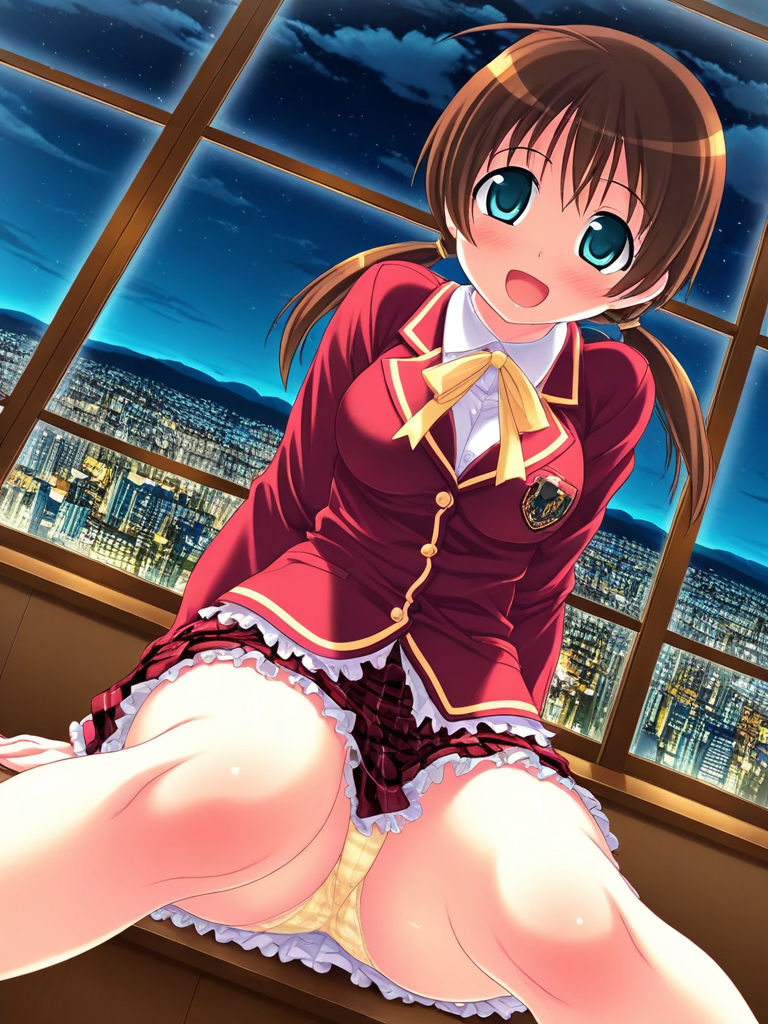 학교 유니폼, 접힌 치마, 빨간 재킷, 자켓, 노란 리본, 프릴,
