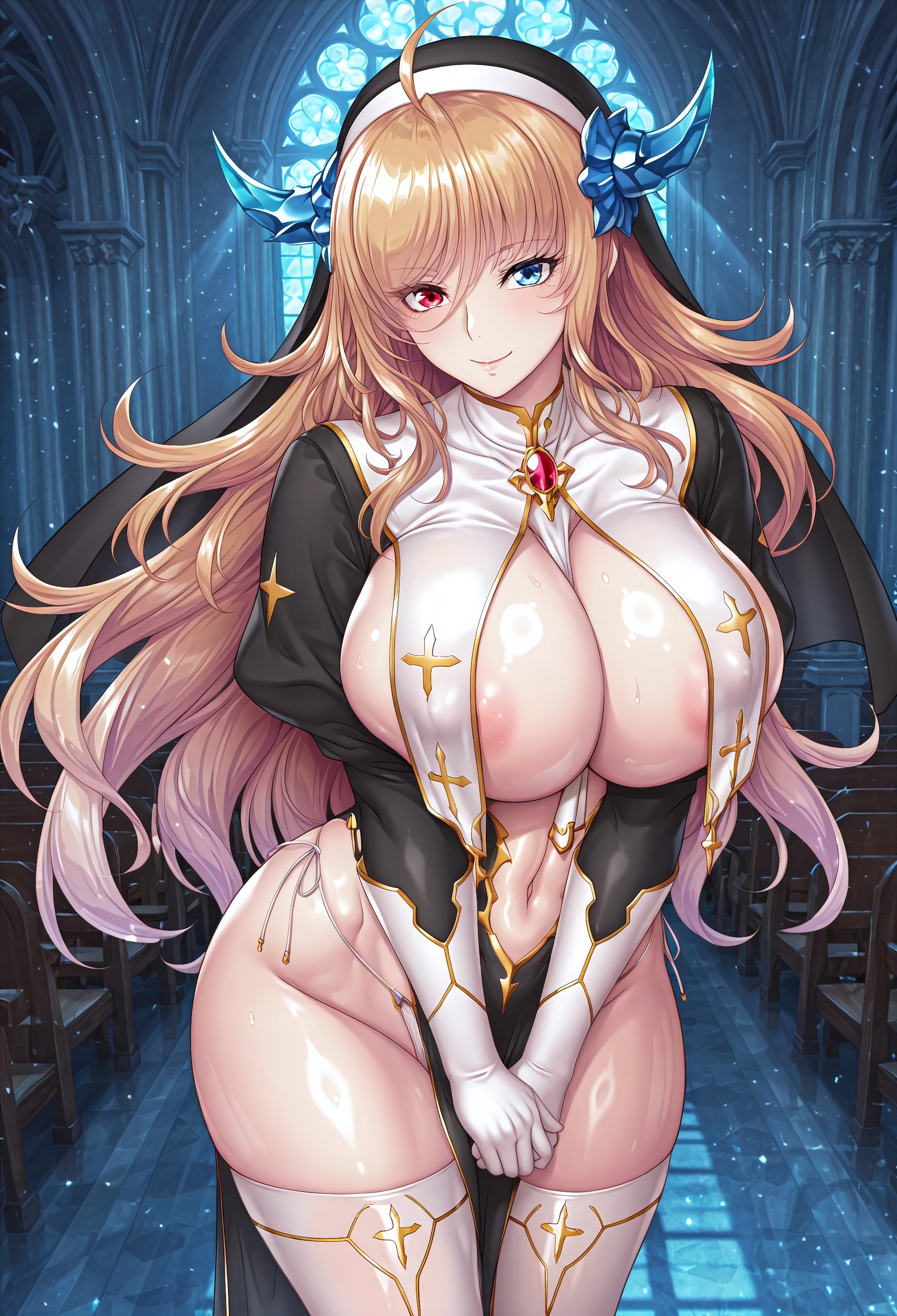 2つ目の衣装:公式アレンジ衣装、修道婦衣装、修道婦、修道婦の頭飾り、ブローチ、宝石、へそ開き、骨盤カーテン、ストリングパンツ、白いパンツ、白いハイソックス、白い手袋、金縁、ハイヒール