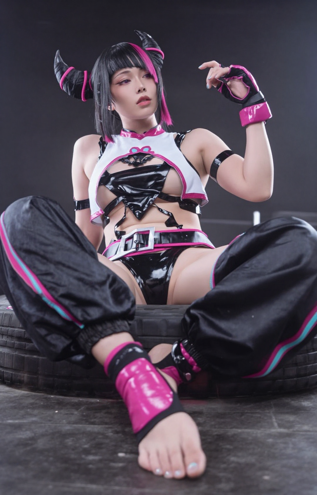 トリガー:ハン・ジュリ、zithan、1girl、胸、シングル、髪の角、黒髪、アンダーブスト、へそ、手袋、複色の髪、大きな胸、指なし手袋、ピンク髪、ズボン、スパイク、ブレスレット、唇、スパイクブレスレット、ゆったりしたズボン、ネイルポリッシュ、ジュエリー、観察者を見つめる、ツートーンヘア、ストライプヘア
