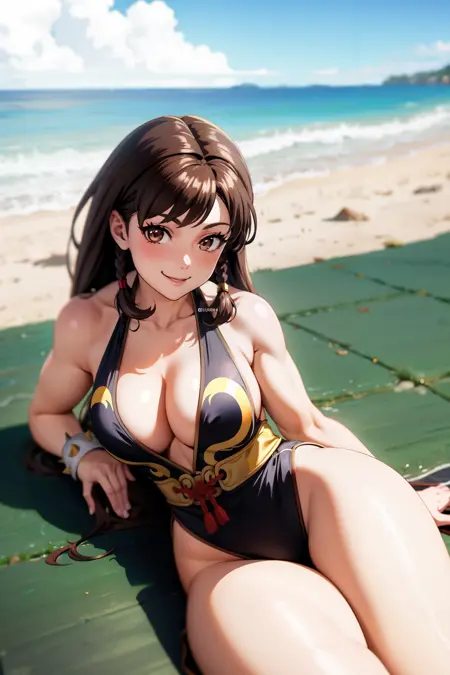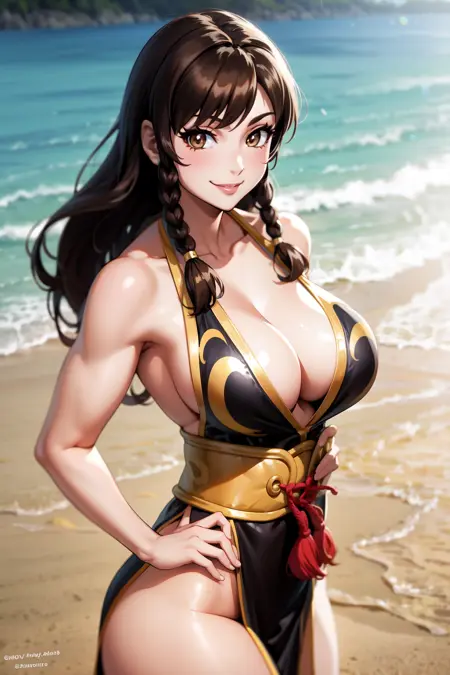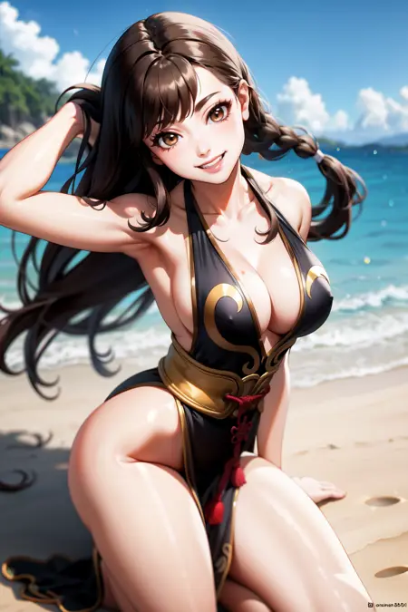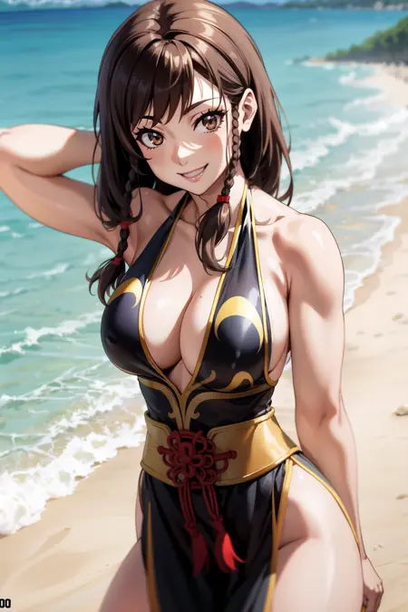 触发词:春丽,棕色眼睛,棕色头发,发型替代,辫子,服装替代,黑色连衣裙,露胸