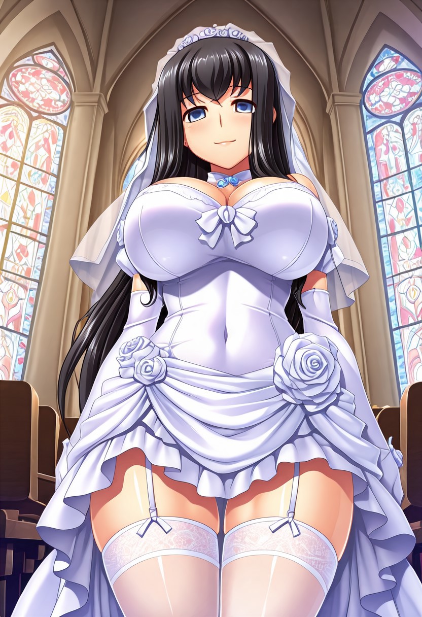 웨딩 드레스, 흰 팔꿈치 장갑, 흰 허벅지 양말, 베일, 신부,