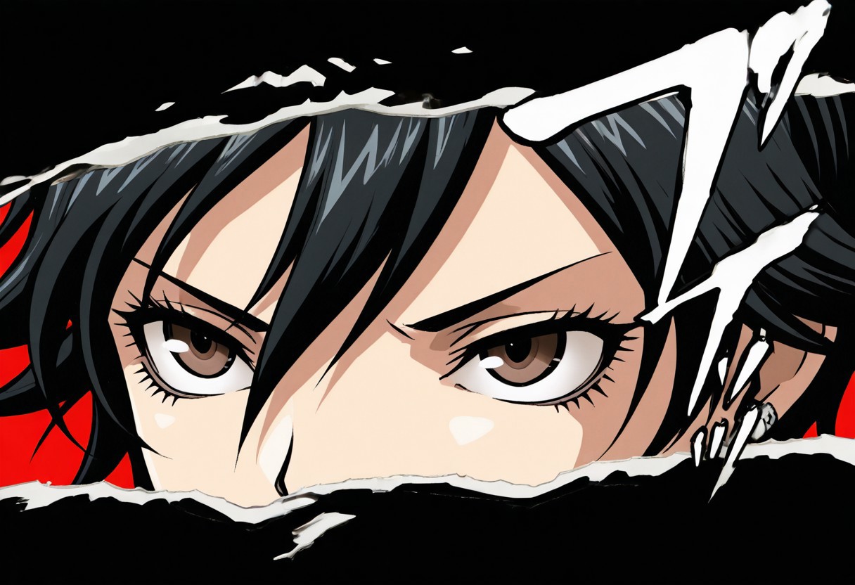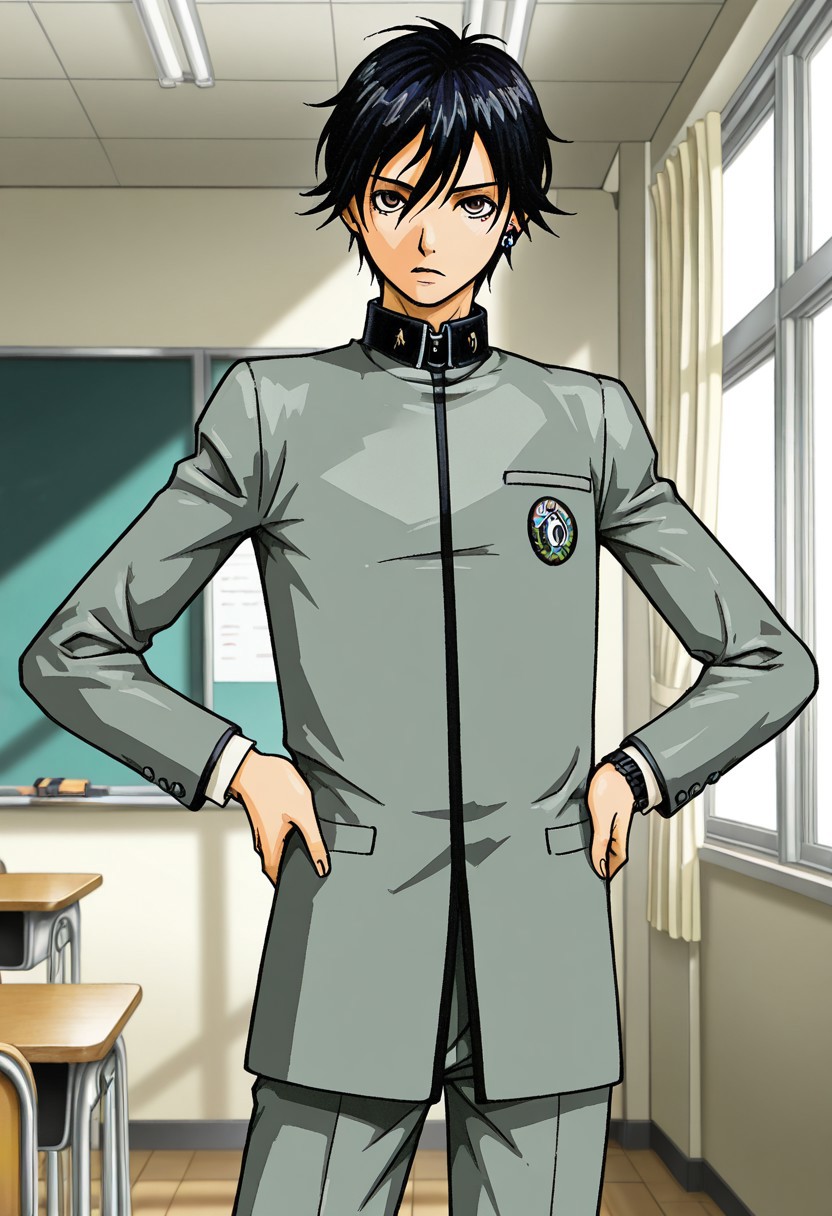 black hair,short hair,earrings,brown eyes,hair between eyes,