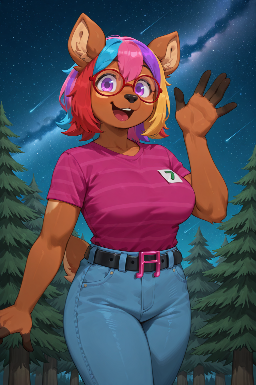 도움이 되는 키워드: 1girl, anthro, deer, multicolored hair, glasses, striped shirt, pink shirt, jeans, belt, belt buckle, note-shaped buckle,