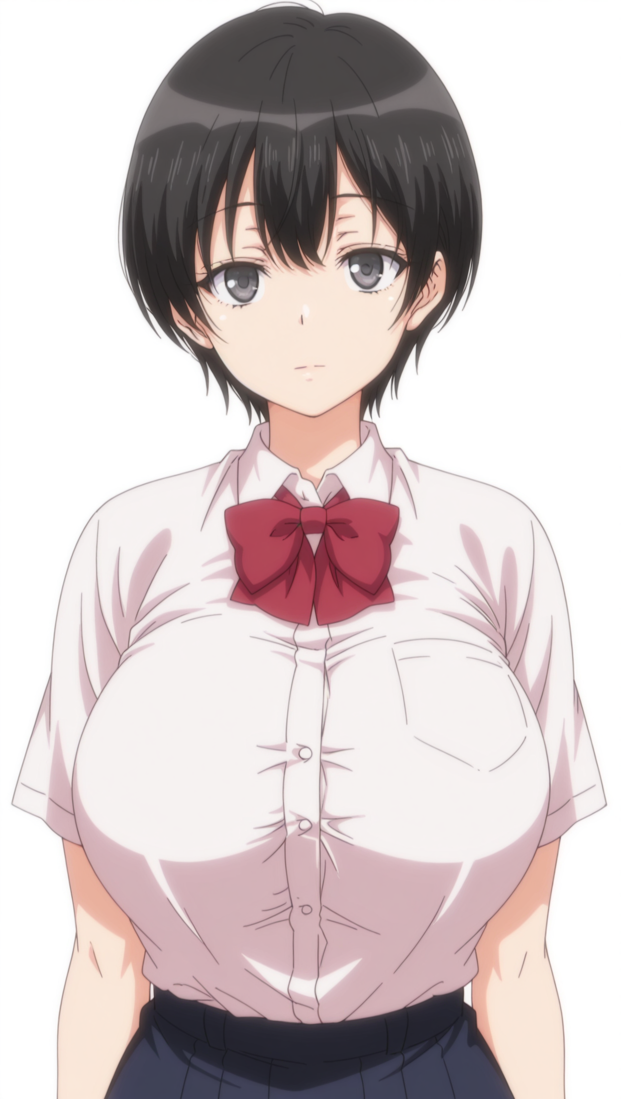 anime coloring, masterpiece, best quality, amazing quality, 4sh41n4m4m1, 1girl, short hair, black hair, grey eyes, large breasts, shirt, white shirt, collared shirt, shirt tucked in, bowtie, short sleeves, skirt, blue skirt, pleated skirt, solo, pose, standing, looking at viewer, from front, ((((white background, simple background))))