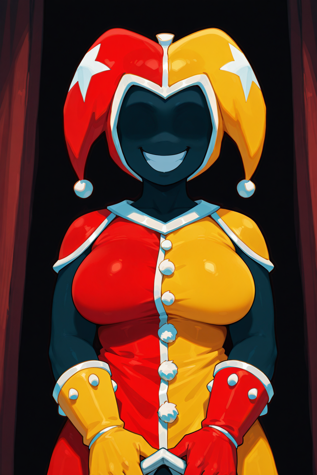 1:Schmuck_F0r、クラown帽、ツートーンの服、黒い顔、笑顔、人間型の体