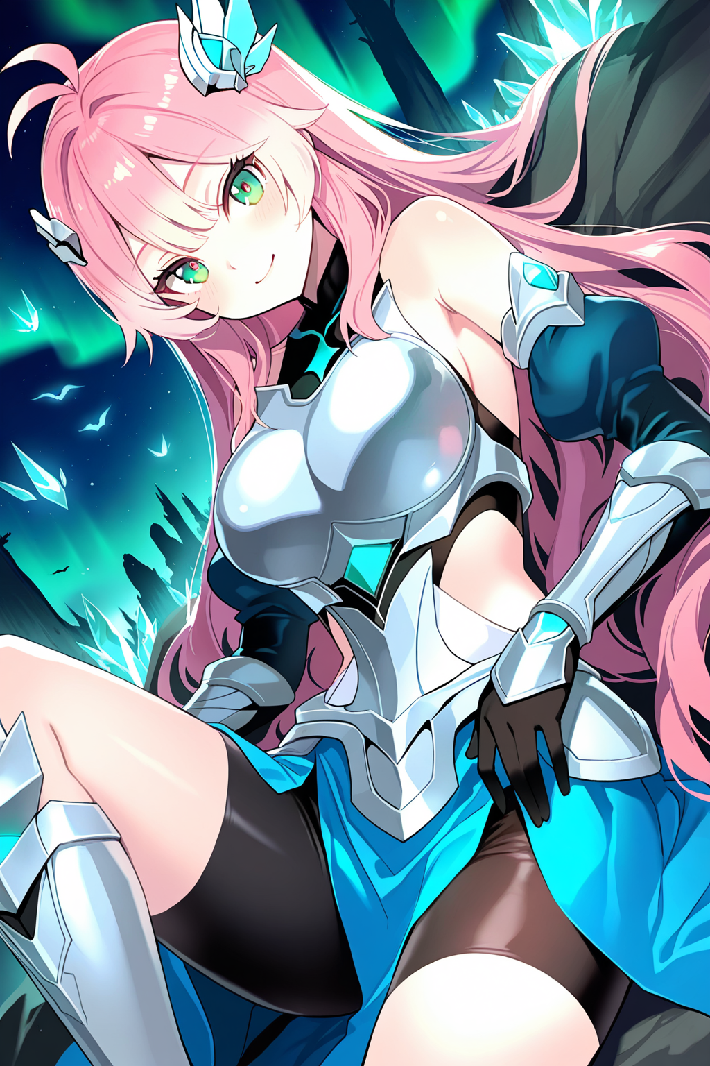 ca_knt, sw_chiiaruel, 1girl, solo, 緑の目, ピンクの髪, グラデーション髪, 大きな胸, 長い髪, 髪を下ろす, ahoge, アンテナ髪, 髪のフラップ, ウィング形状の髪飾り, シルバーの胸板, ブラックアンダーシャツ, サイドカットアウト, 肩を露出, 外れ袖, ファンシーな袖, シルバーのガントレット, ブラック手袋, シルバーのフォールド, 青いスカート, 盆部カーテン, ブラックバイクショーツ, シルバーのアーマードブーツ,