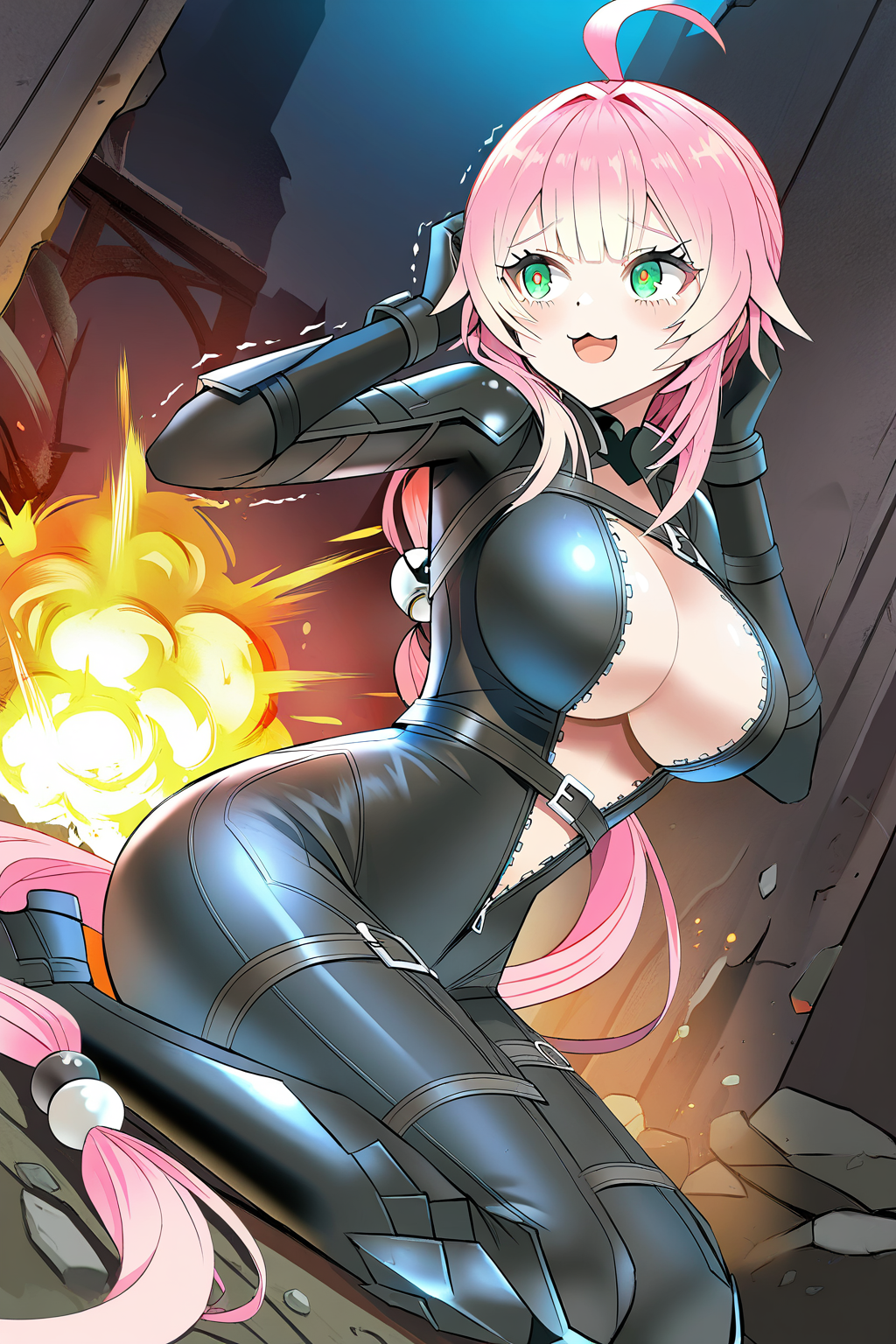 ca_bds, sw_chiiaruel, 1girl, solo, 緑の目, ピンクの髪, グラデーション髪, 大きな胸, ローポニーテール, ahoge, 髪のフラップ, 異常に長い髪, ブラックボディスーツ, 中央開口部, 部分的に開いている, 胸元, 複数のベルト, ブラックアーマードブーツ,