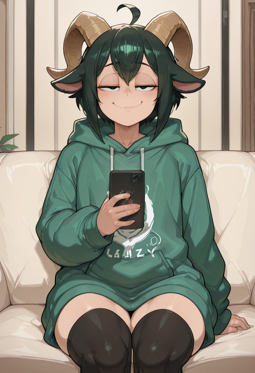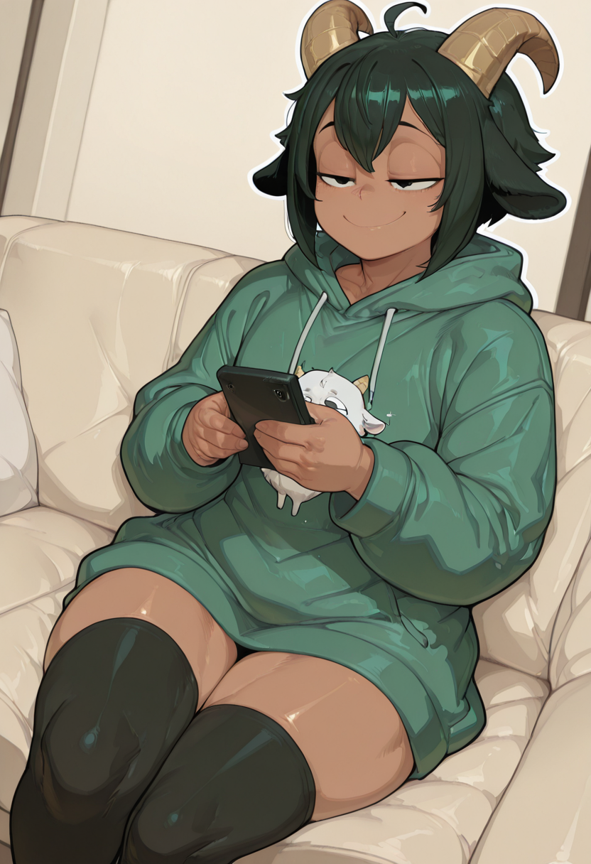LustinKoa, dark-skinned femboy, androgynous, soft features, , thigh highs, anime style, detailed face, masterpiece, black hair,naked,cum, short hair, long dick,full,body,solo,smug,goat horns,