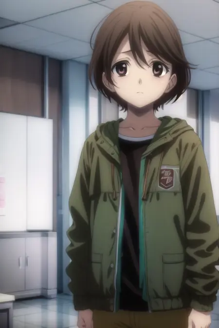 yuuki ashikaga casual, brown hair, shirt, long sleeves, male focus, open clothes, socks, pants, hood, pillow, (brown eyes:1.5), short hair, (green jacket:1.5), glasses,