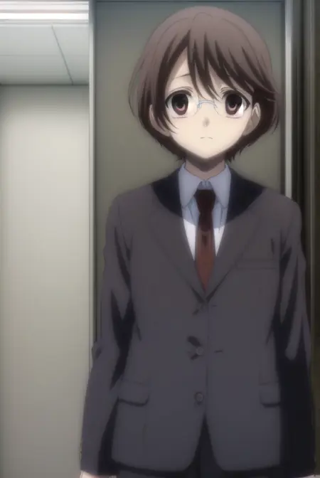 yuu ashikaga uniform, short hair, brown hair, long sleeves, school uniform, male focus, necktie, glasses, bag, formal, suit, (brown eyes:1.5),