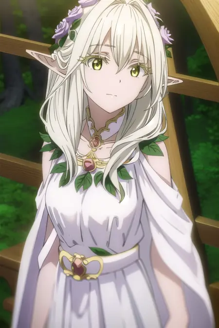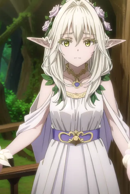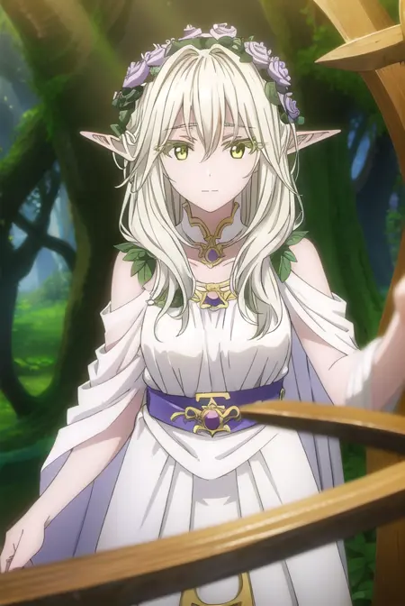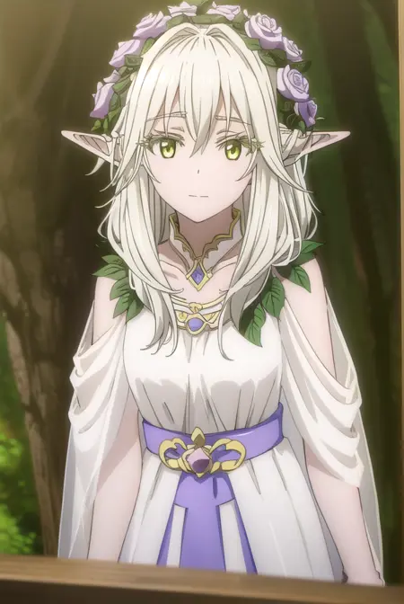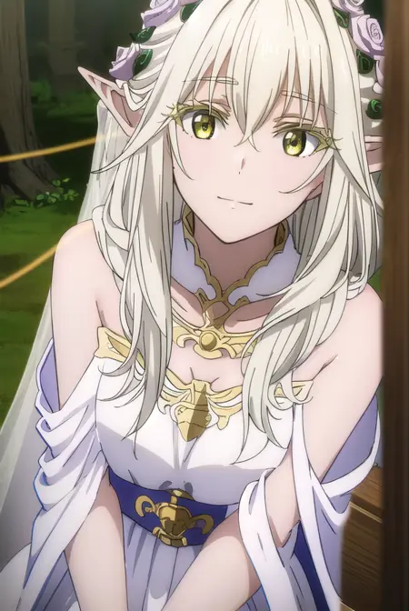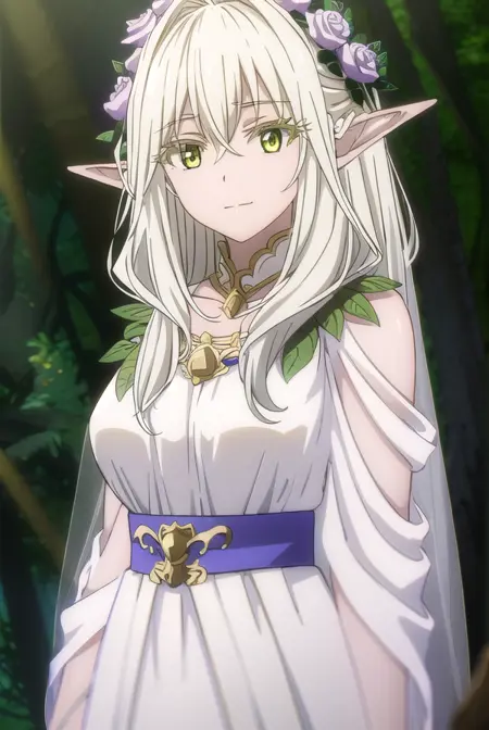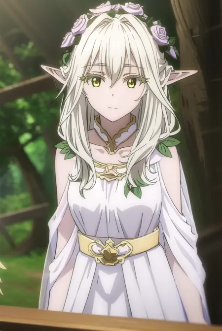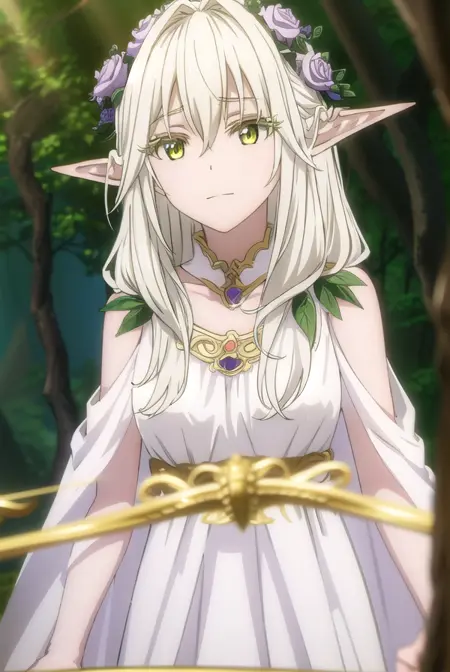 숲의 공주, 긴 머리, 머리 장신구, 눈 사이의 머리카락, (노란 눈:1.3), 하얀 머리, 꽃, 뾰족한 귀, 머리에 핀 꽃, 장미, 머리카락이 들어간 꽃, 엘프,