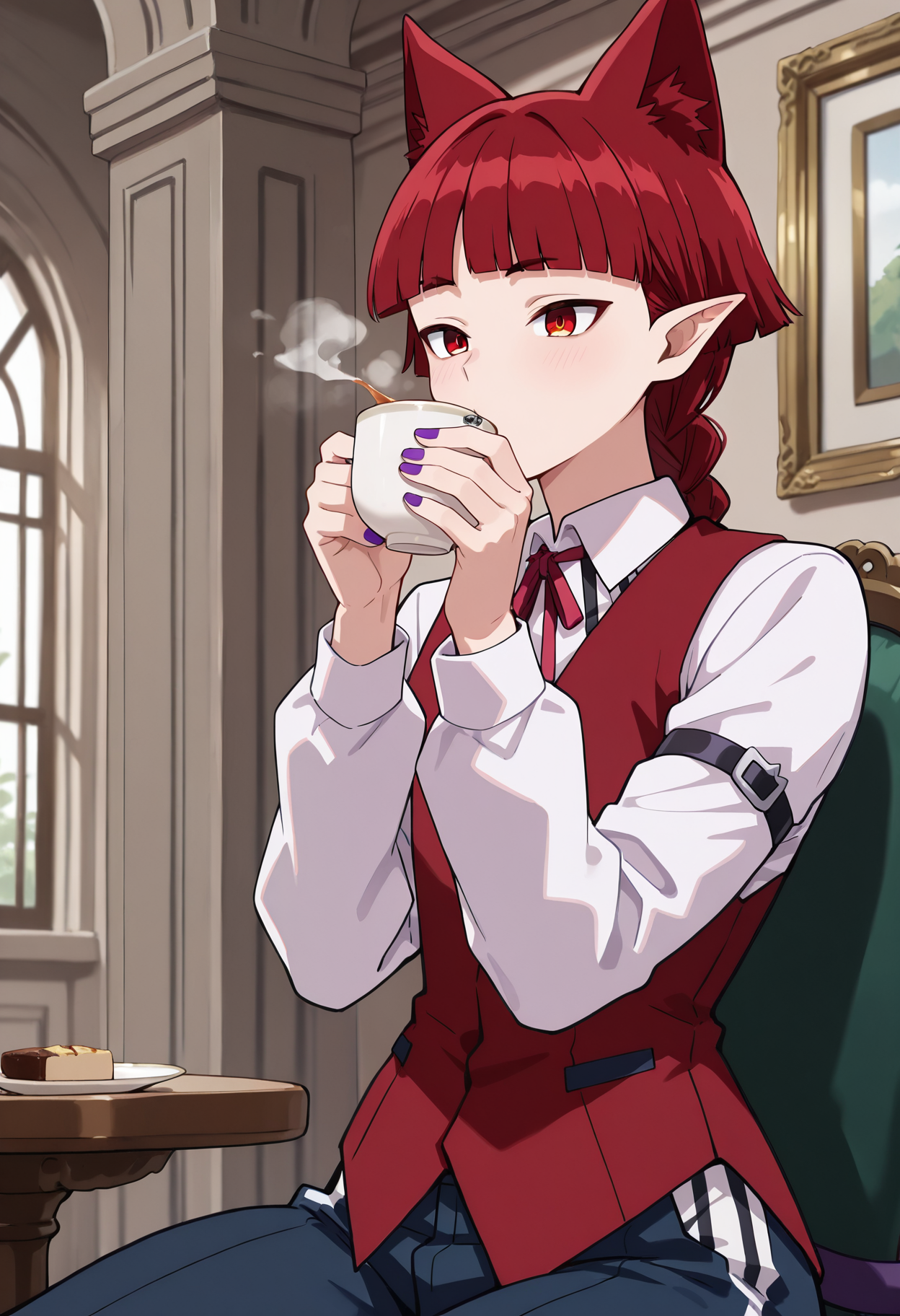 トリガー単語: 1boy,OperaK,赤髪,赤い髪,赤い猫の耳,エルフの耳,赤い目,紫の猫の尾,紫のネイルポリッシュ,片側の髪の編み込み,まっすぐな前髪,