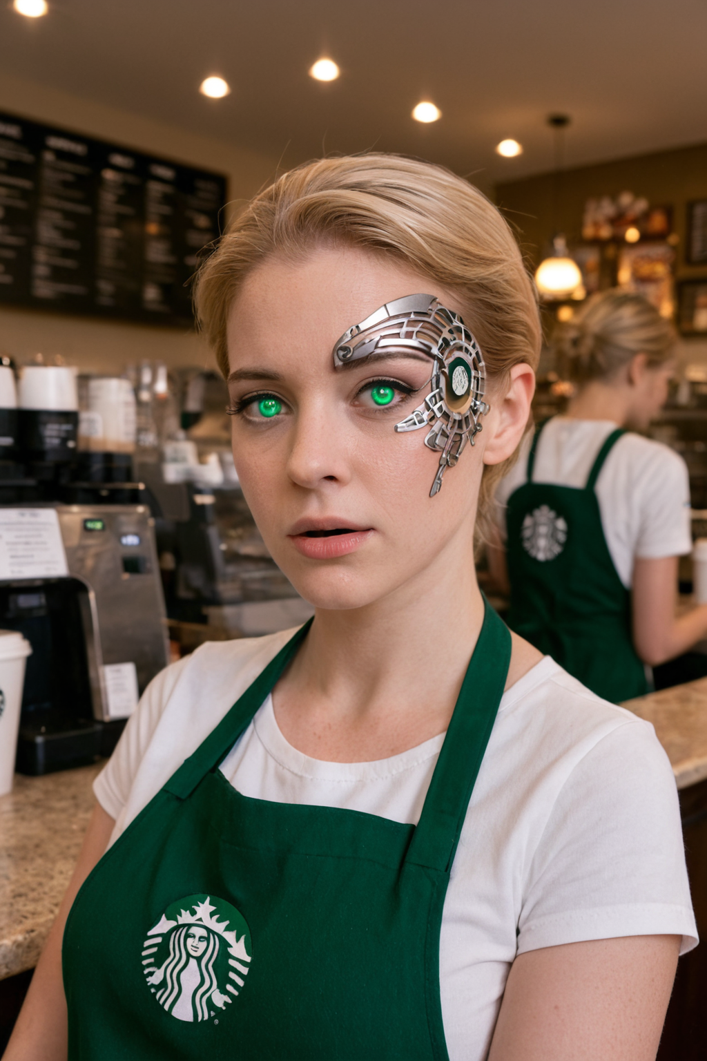 これにより、スタートレックのボーグのように顔にロボットの装着物を持つ人物が生成されます。これは部分的な同化にすぎません。完全なボーグの外見はかなり不気味です。