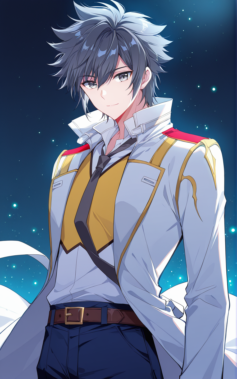 Wulin_복장, 흰 코트, 긴 코트, 열린 코트, 금장식 코트, 빨간 어깨 장식, 높은 칼라, 흰 셔츠, 칼라 셔츠, 노란 가슴 패널, 진한 파란 넥타이, 갈색 벨트, 흰 바지, 슬림한 바지,