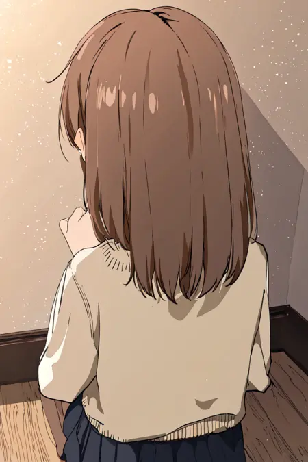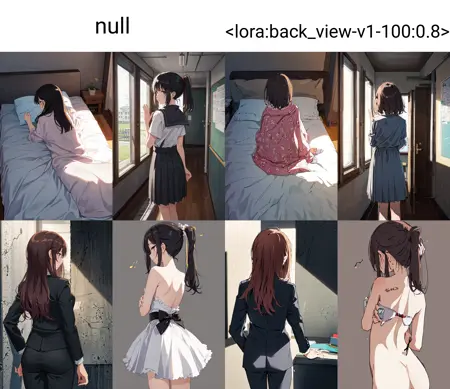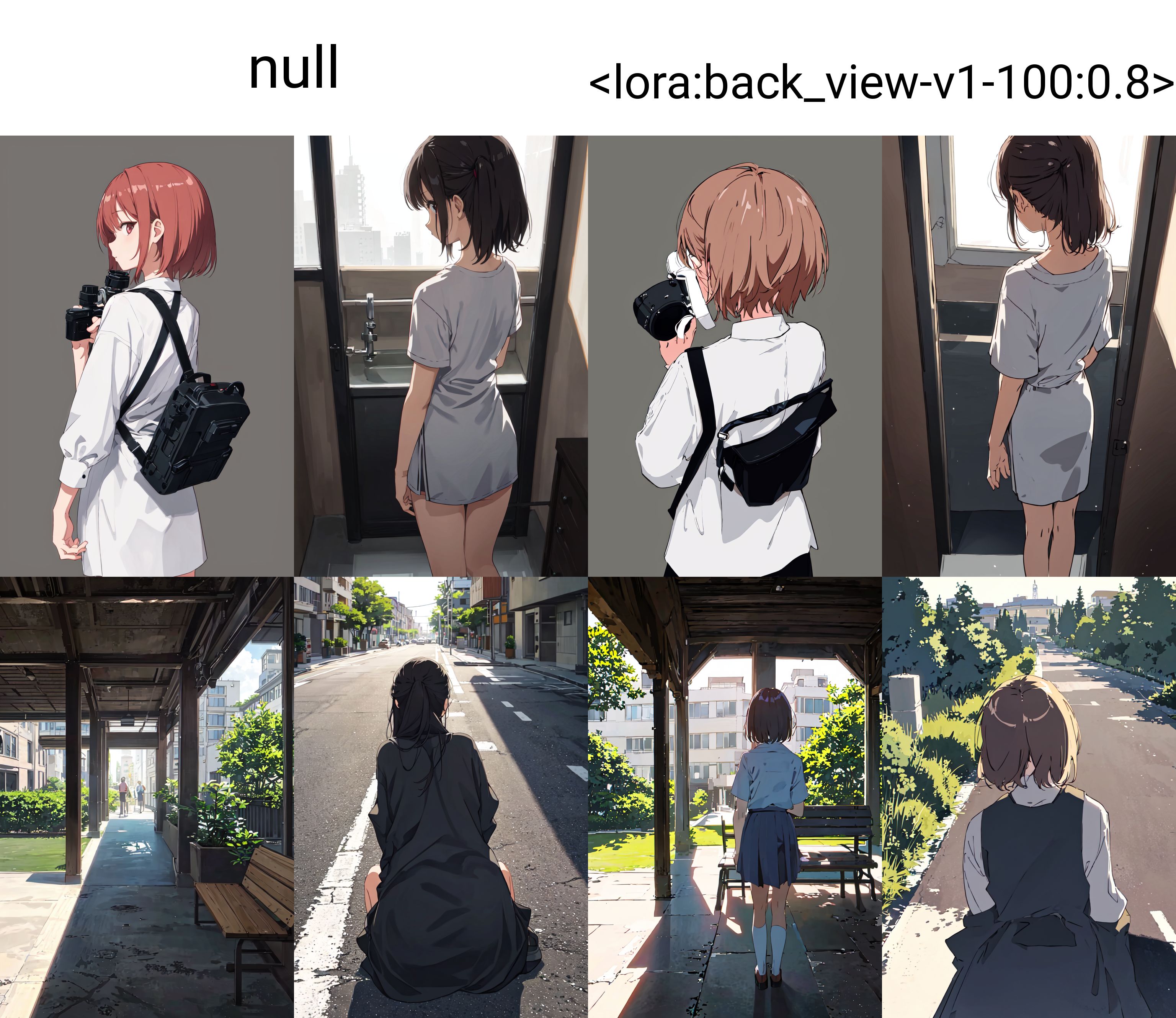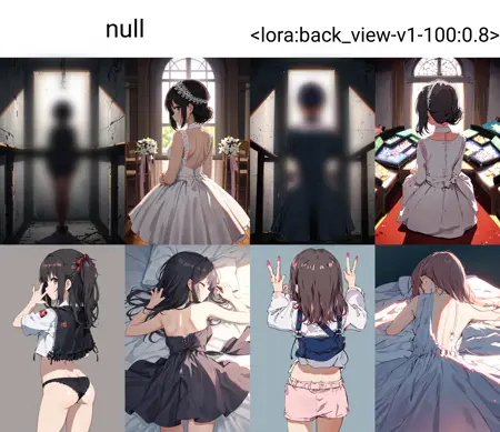 当您不希望角色转头时的绝佳辅助(推荐强度0.6~0.8)。本模型从生成图像及Pixiv上13,000张背面图像中精选约100张进行训练。未来计划通过蒸馏优化模型内容,并细化提示词标注。