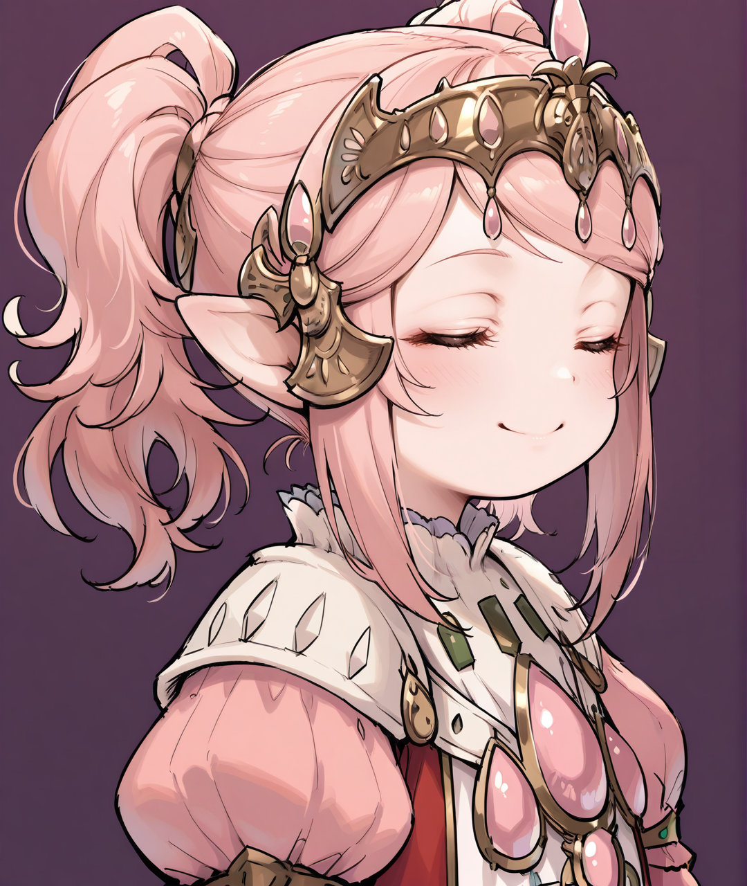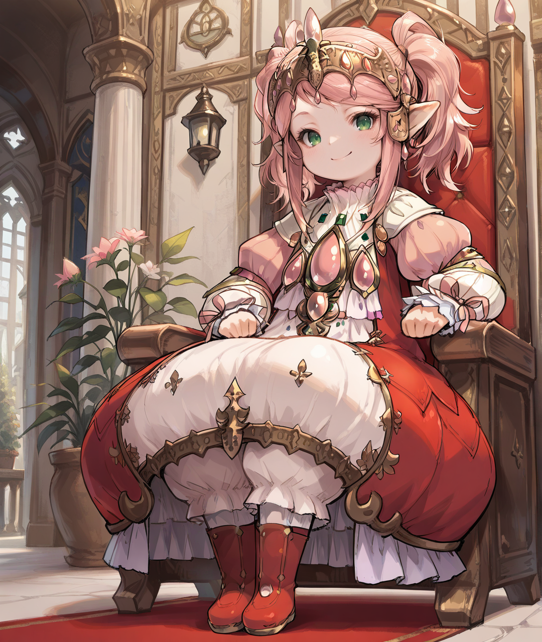 タグ: NanamoBase、ララフェル、尖った耳、緑の目、ピンクの髪、ミディアムヘア、短いツインテール、サイドロックス、金のティアラ、ピンクの宝石、金の髪飾り、平らな胸、ジュエリー、金のトリム、多色のドレス、ピンクのドレス、赤のドレス、白のドレス、フリル付きドレス、ピンクのふわふわのロングスリーブ、ジュリエットスリーブ、手首より長いスリーブ、白いふわふわのパンツ、赤い靴