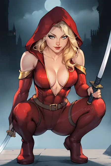 トリガー:女性、赤い衣装とフード、剣を握っている