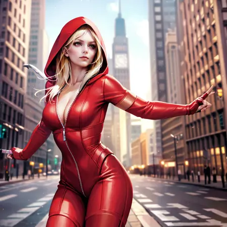 트리거: 여자, 빨간 옷과 모자를 착용하고 검을 들고 있음