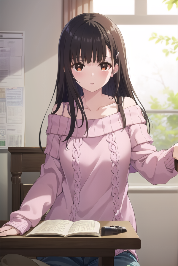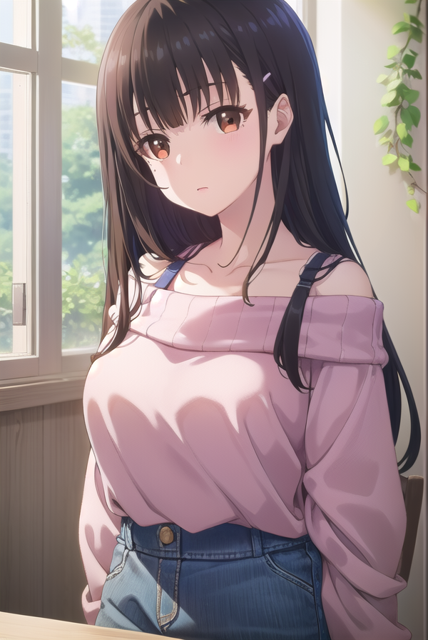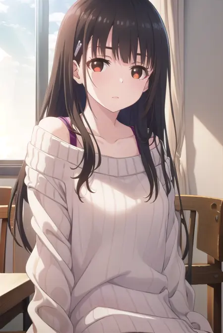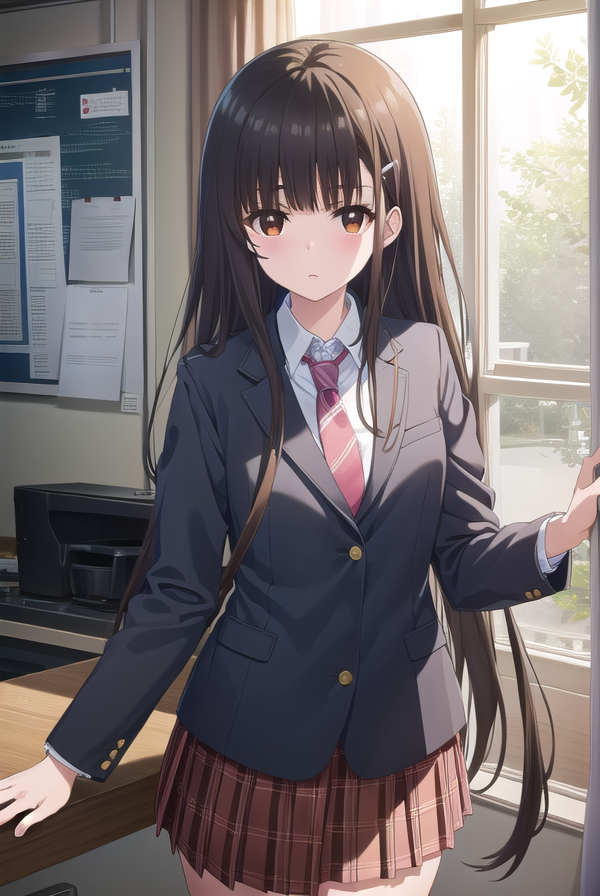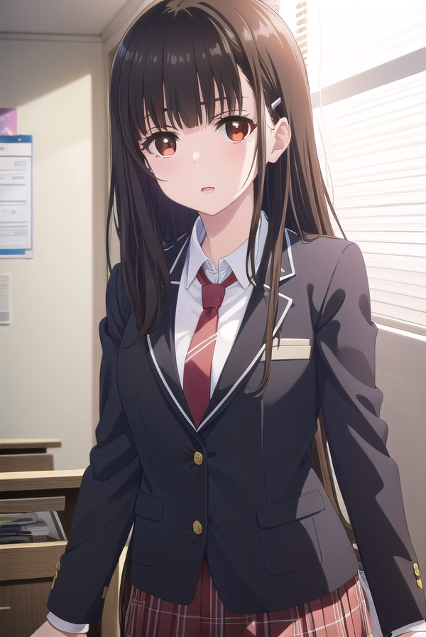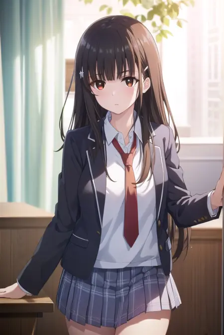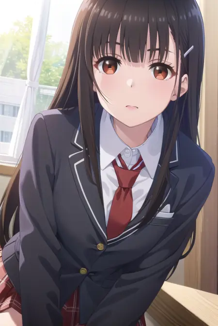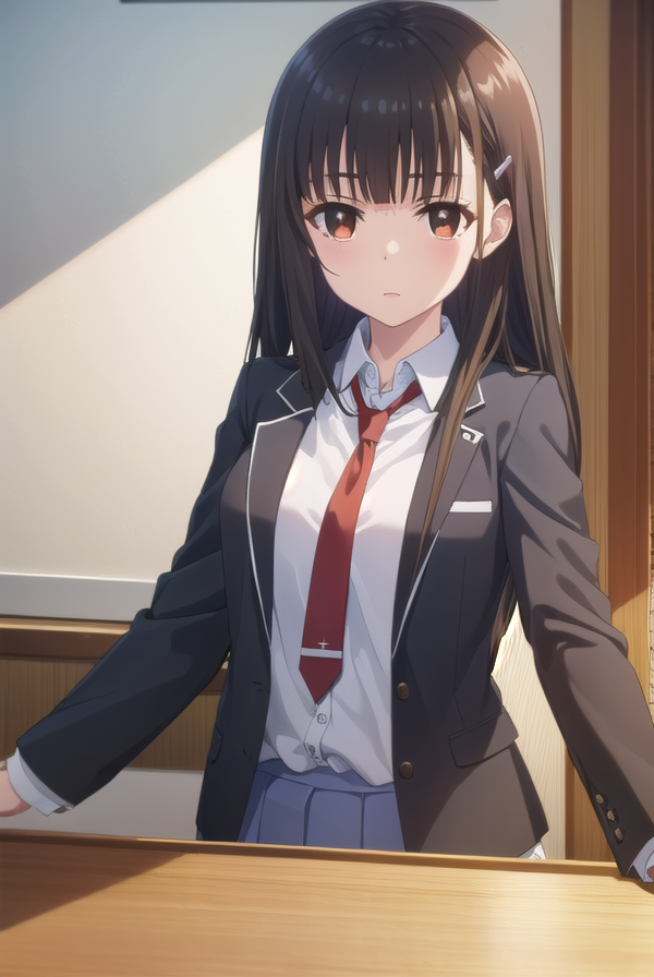 yume irido, long hair, bangs, black hair, hair ornament, (brown eyes:1.5), hairclip,
