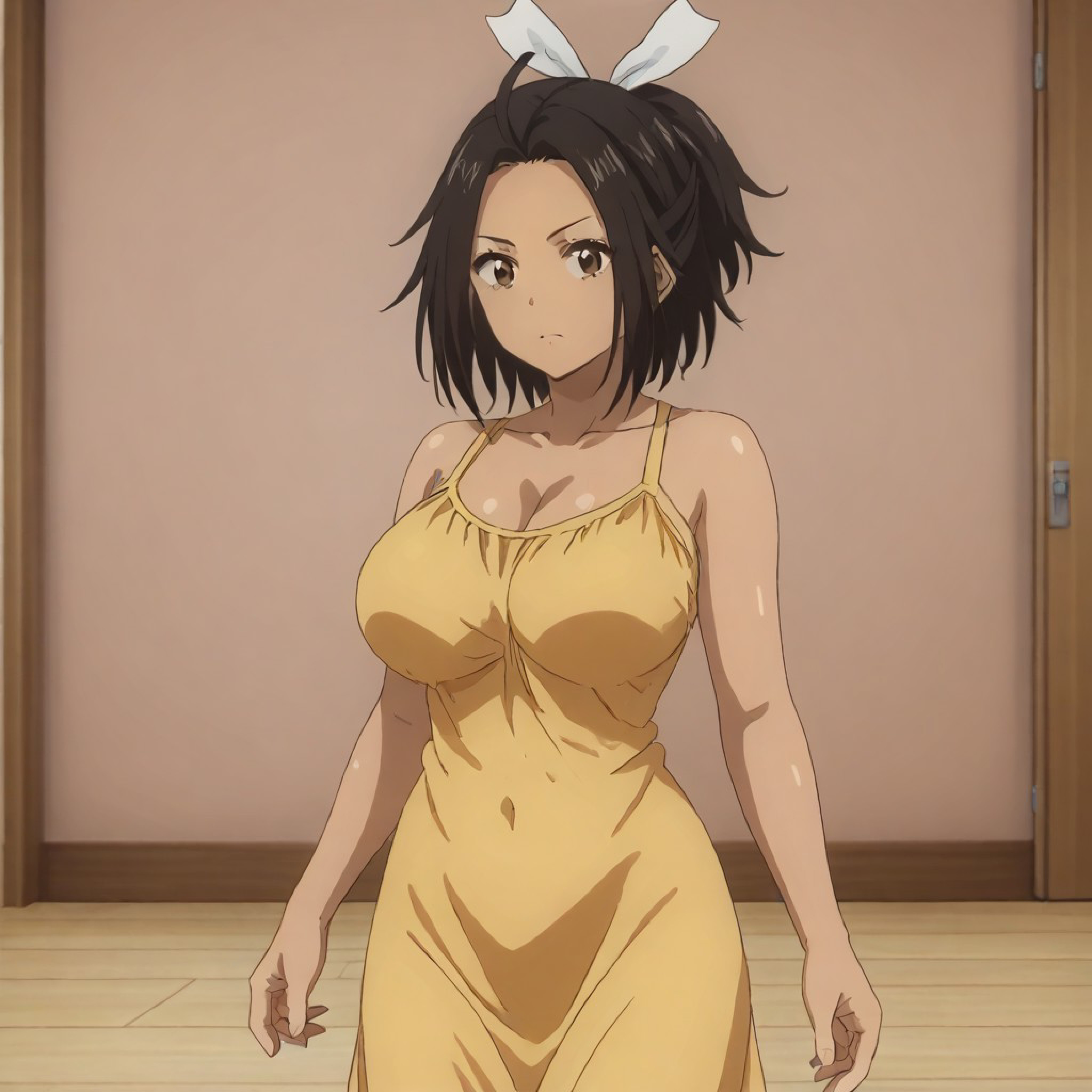 black hair, brown eyes, 1girl, dark-skinned female, hair ribbon, mature female, dark skin