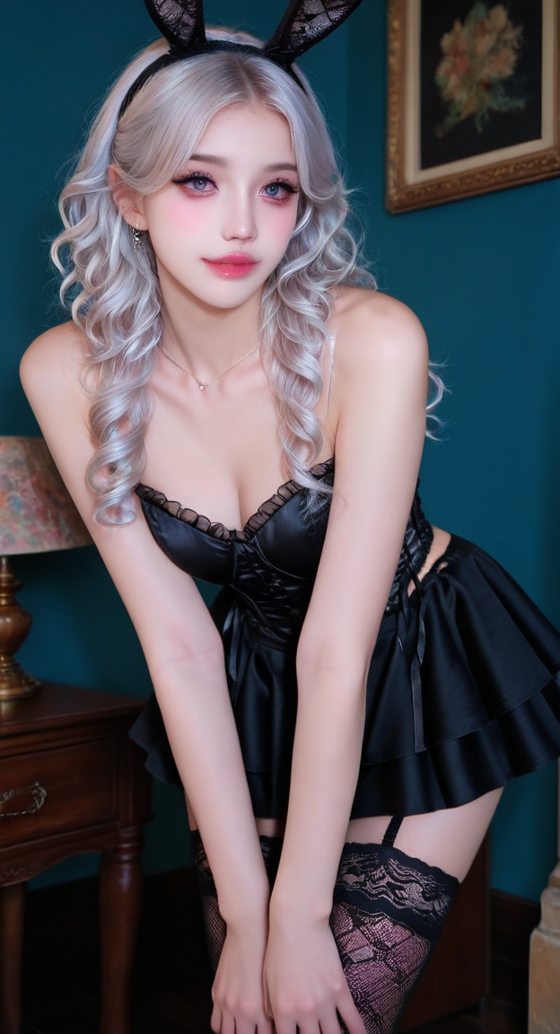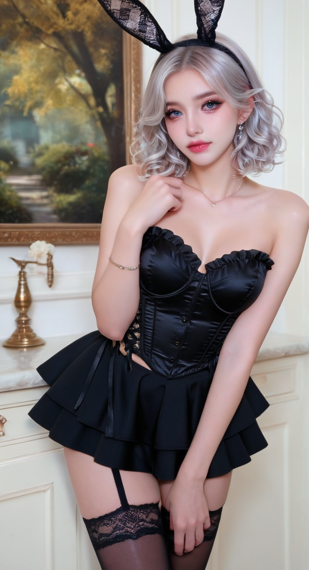 | トレーニングワード | xg1,shoulders,garter straps,(adjusting black lace bunny ears headband:1.1),black satin corset top with ruffled sweetheart neckline,intricate black floral lace side panels and side ties,matching black layered tutu mini skirt with ribbon details,black lace thigh-high stockings with garter straps,zettai ryouikiコピーしました! |