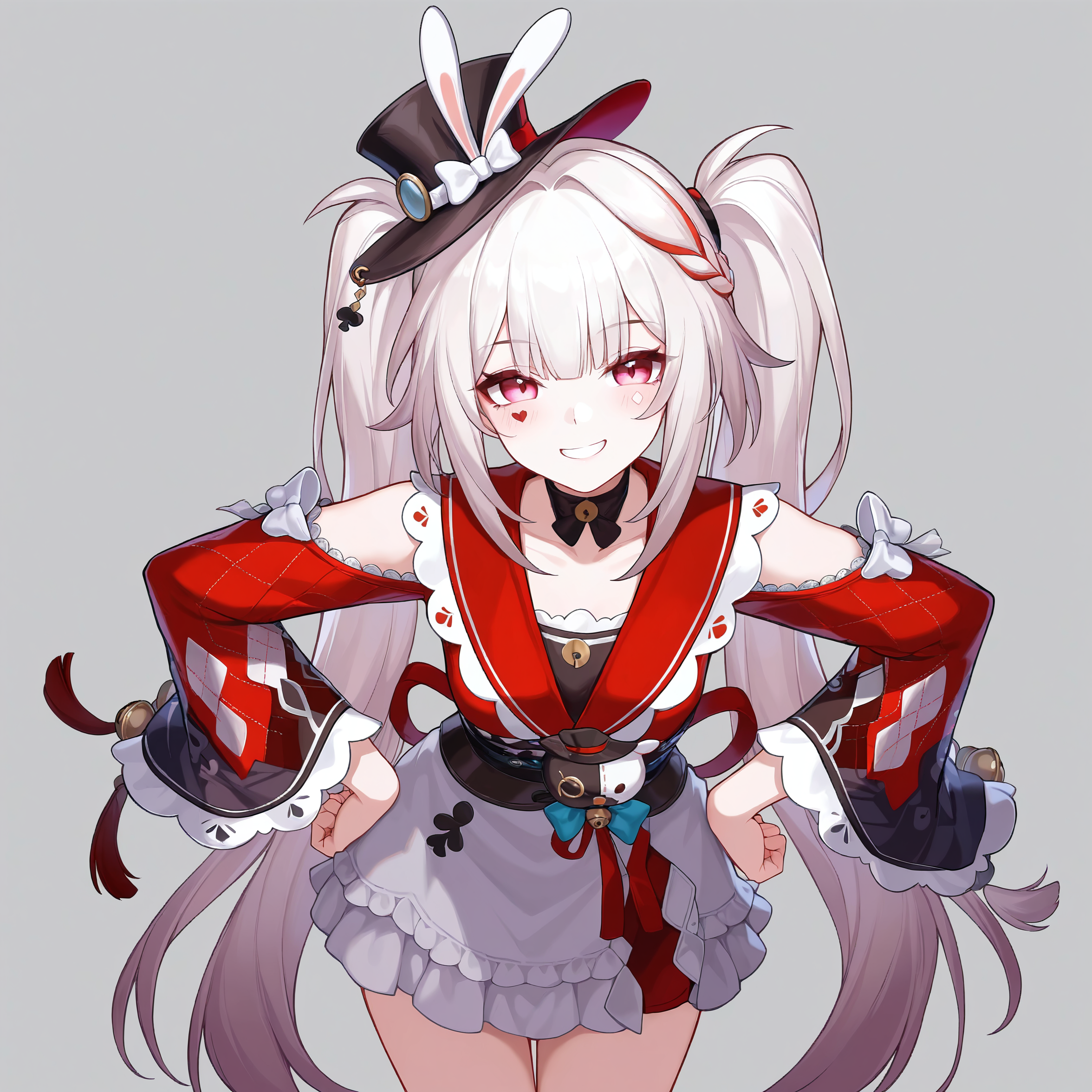 hat, dress, choker, gloves, boots, earrings。衣装の変更: 一般的なチェックポイントモデルでのテストでは、上記の公式衣装タグを削除することで、好きな衣装要素を自由に追加できました。特定のチェックポイントモデルで推論時に公式衣装の残留が残る場合は、上記タグをネガティブプロンプトに追加することを検討してください。