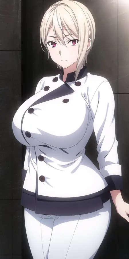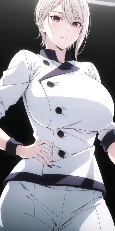 White_chef_uniform_White_jacket_White_pants: 그녀의 요리사 복장.