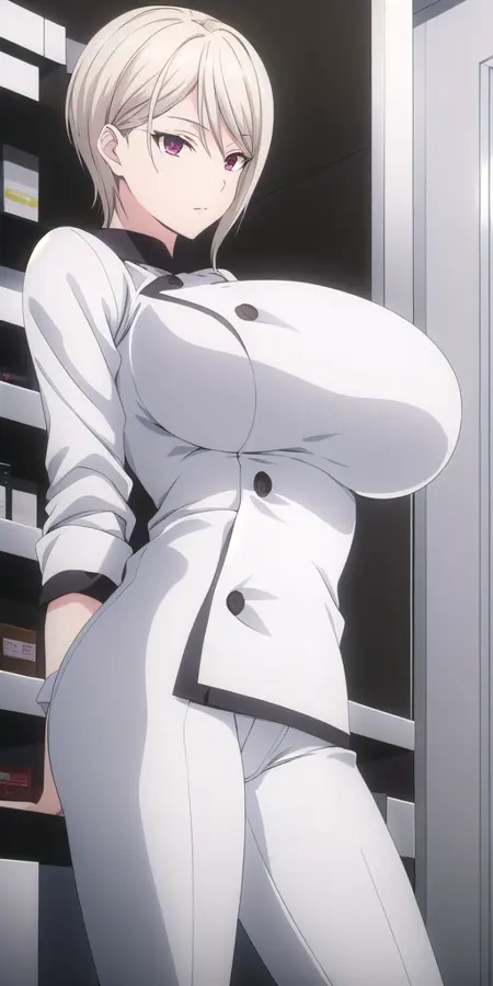White_chef_uniform_White_jacket_White_pants: her chef suit.