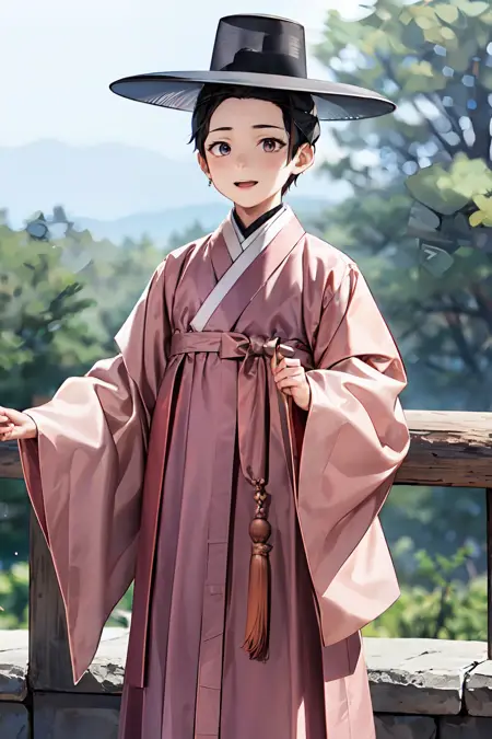 男性服饰通常在穿着韩服的同时,还需搭配头顶的发髻(topknot)+ 颈饰(mangeon)+ 帽饰(hat accessories)。