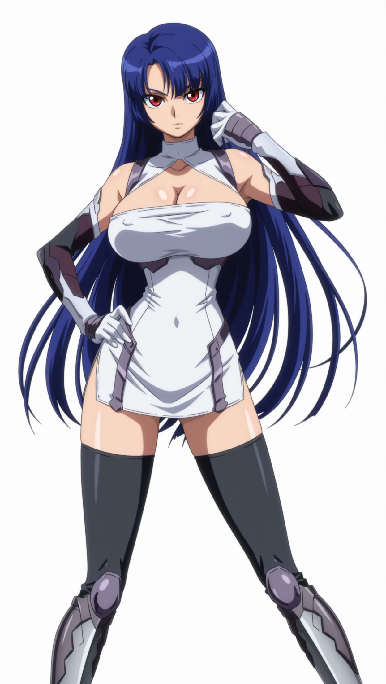 anime coloring, masterpiece, best quality, amazing quality, y4tsumur4s4k1, 1girl, long hair, blue hair, red eyes, large breasts, dress, white dress, cleavage cutout, elbow gloves, armored gloves, thighhighs, black thighhighs, knee boots, armored boots, solo, pose, standing, looking at viewer, from front, ((((white background, simple background))))