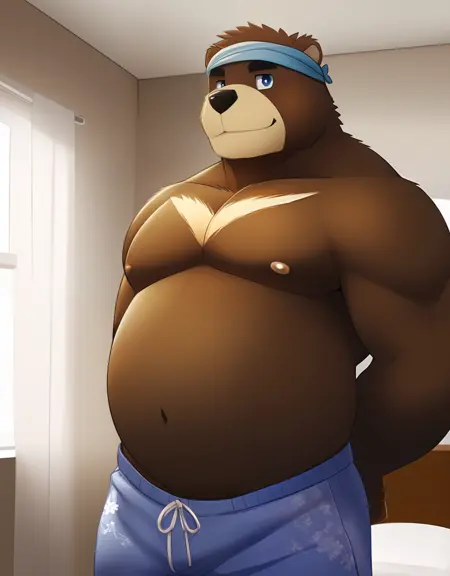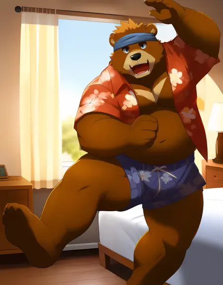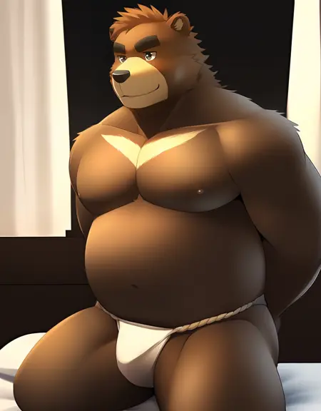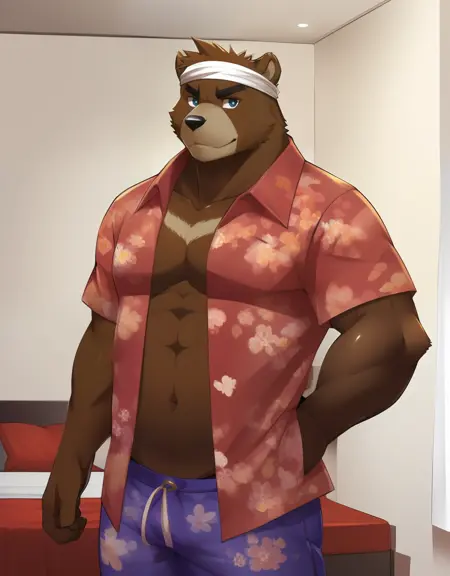 Related words : brown fur, two-tone fur, brown hair, short hair, facial hair, body fur, pubic hair, navel hair, chest hair, black eyes, thick eyebrows, bear, bear ears, animal nose, headband, bandages, bracelet, fundoshi, male swimwear, blue pants, blue shorts, boxers, collared shirt, pink shirt, floral print, open shirt, open clothes, short sleeves, blush (v3-), large penis (v3-), veiny penis (v3-)