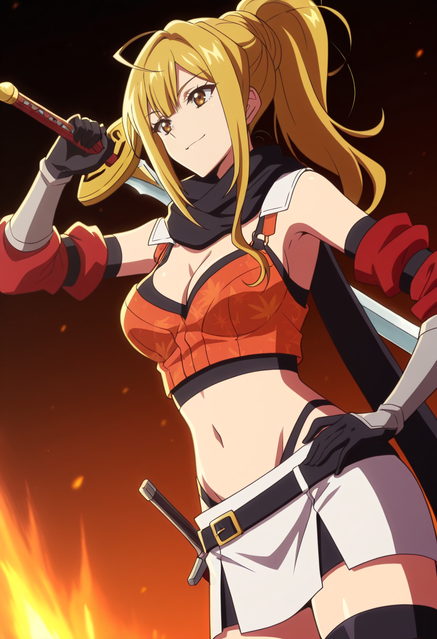 ItsukiCroptop, 스카프, 가슴 노출, 장갑, 배꼽, 검은 스카프, 허벅지 길이 양말, 허리, 재킷, 어깨 노출, 검은 장갑, 치마, 셔츠, 분리형 소매, 팔꿈치 장갑,