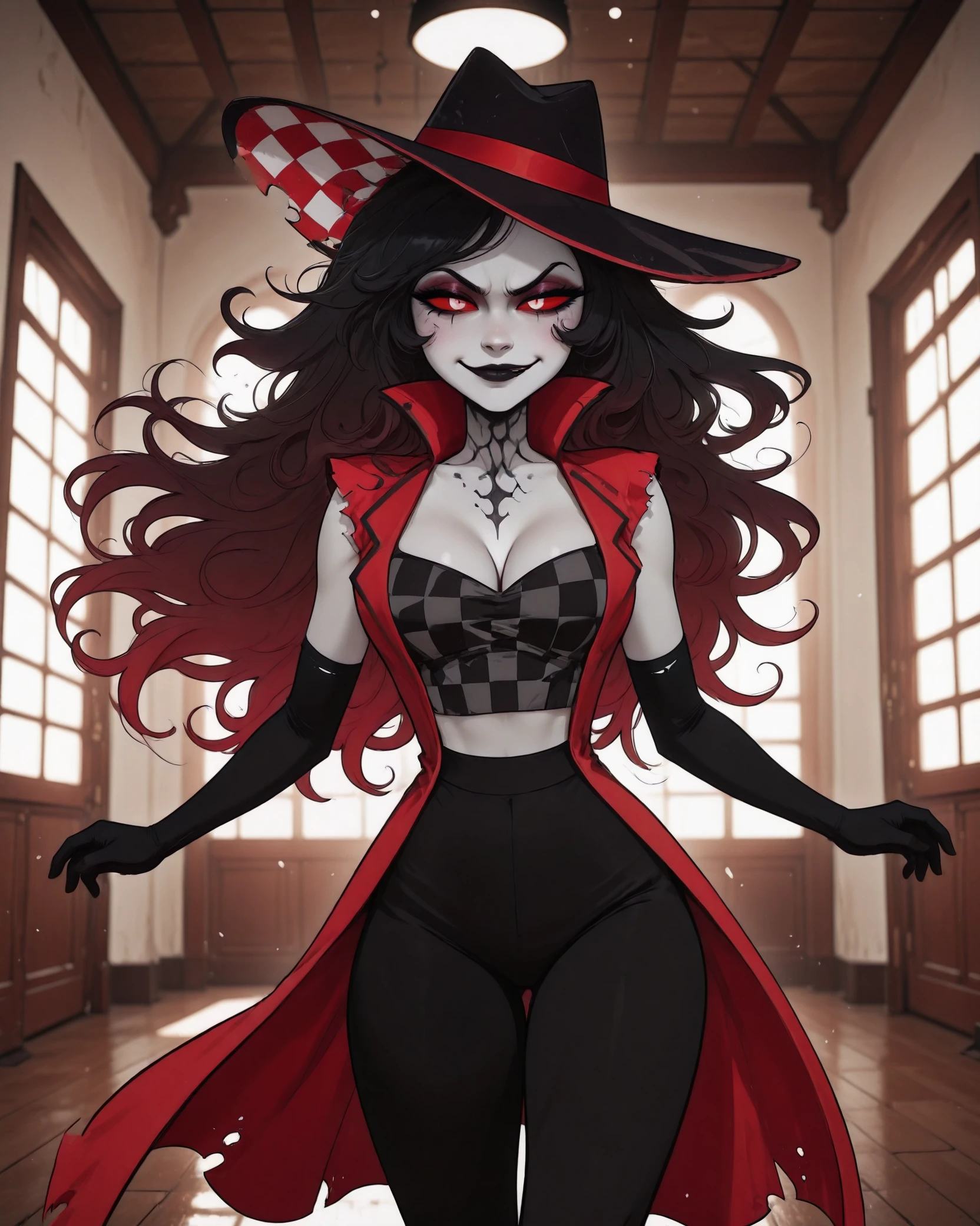 외모: R00HH, 1girl, 창백한 피부, 검은 입술, 붉은 공막, 붉은 눈, 긴 머리, 검은 머리, 그라데이션 머리, 메이크업