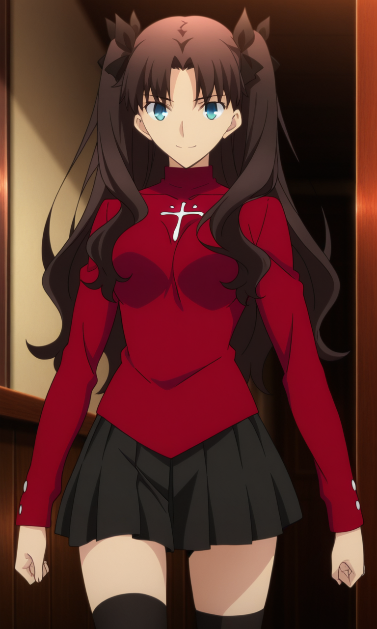 遠坂リン、1人女孩、シングル、茶色の髪、長い髪、青い目、分け目のある前髪、赤いセーター、タートルネック、長袖、クロス柄、黒いスカート、プリーツスカート、ミニスカート、黒いタイツ