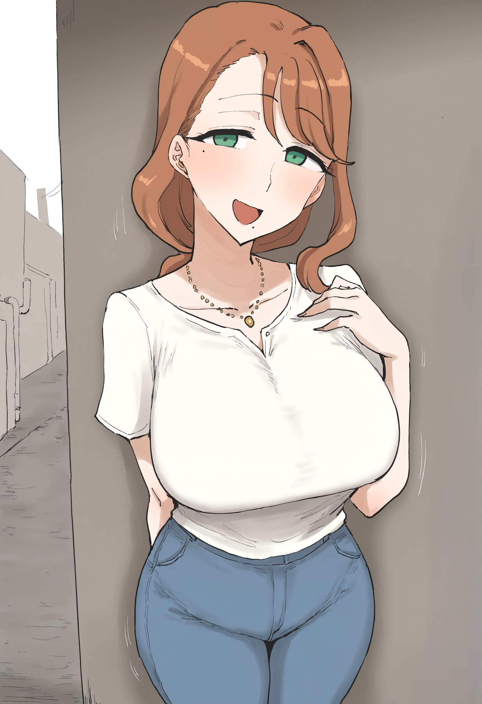 Reiko, (1girl, long hair, brown hair, green eyes, large breasts, mature female, hair over shoulder, ponytail) from Motherly.