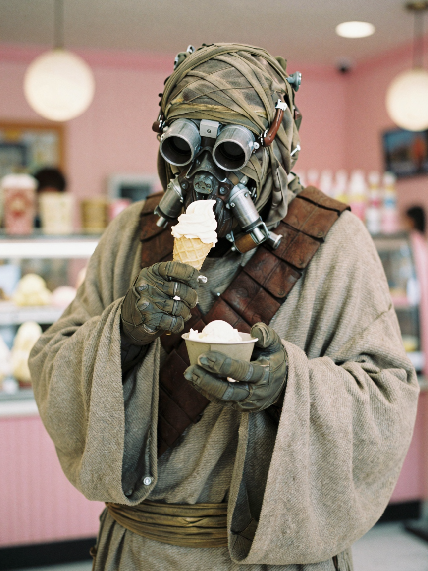 프롬프트에 "tskn, a tusken raider"를 포함시키고 강도를 약 0.92-0.94로 설정했을 때 가장 좋은 결과를 얻었습니다. 강도가 더 낮으면 마스크가 너무 왜곡되고, 더 높으면 LoRA의 전반적인 유연성이 떨어집니다.